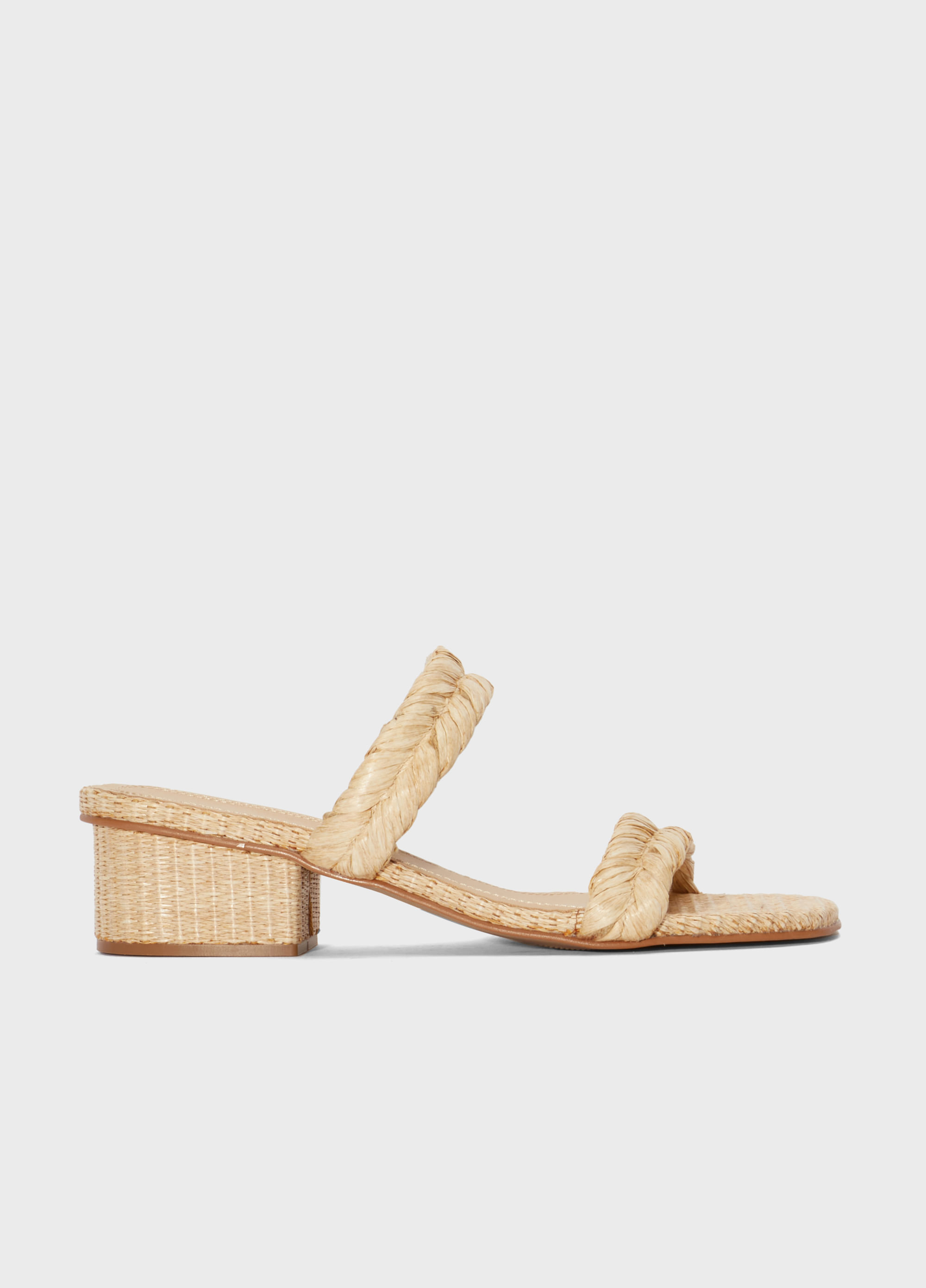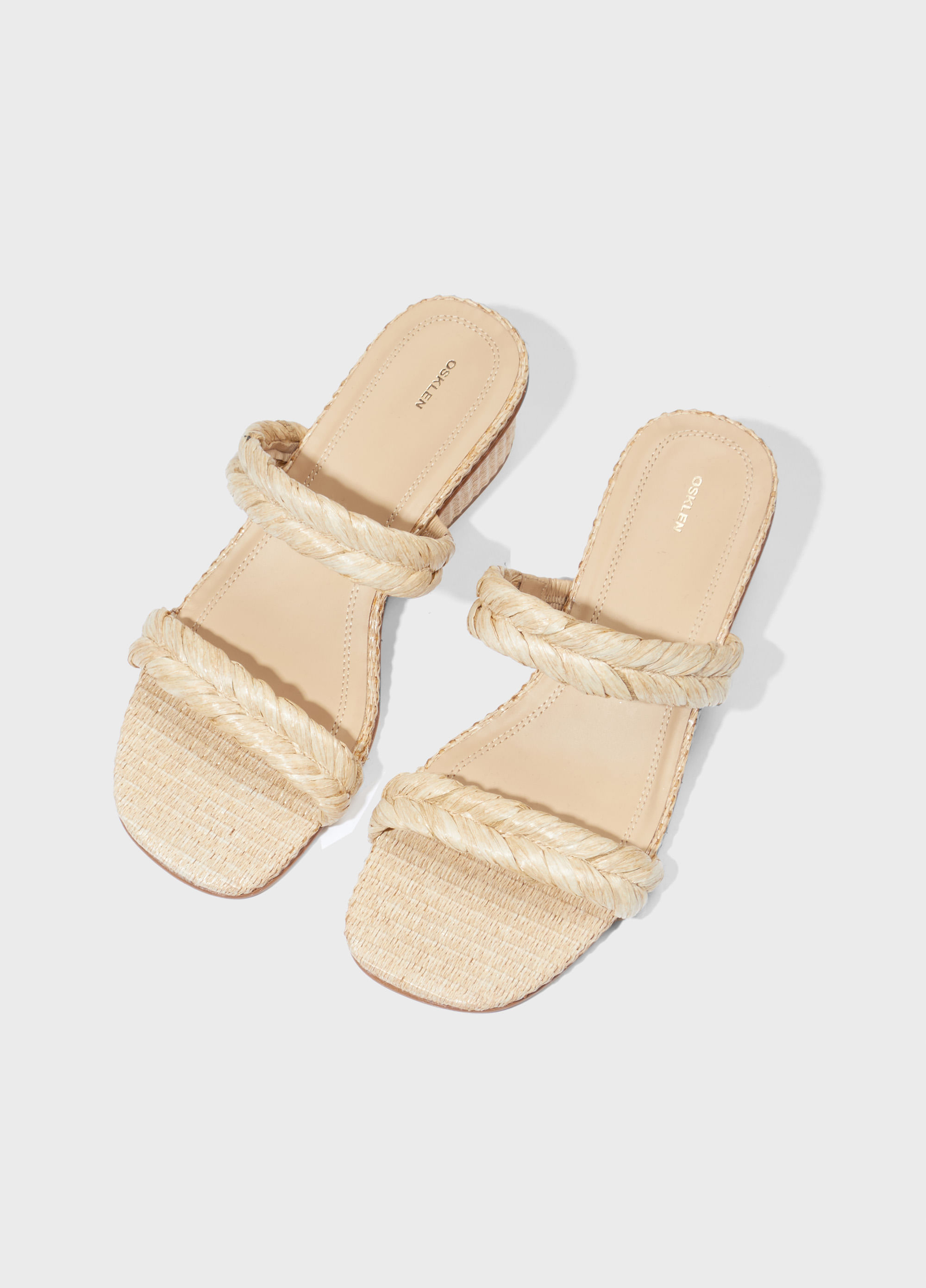 Sandália de salto médio. Cabedal com duas tiras de ráfia trançadas, palmilha e salto forrados em ráfia com gota em couro bovino. Sola em borracha.