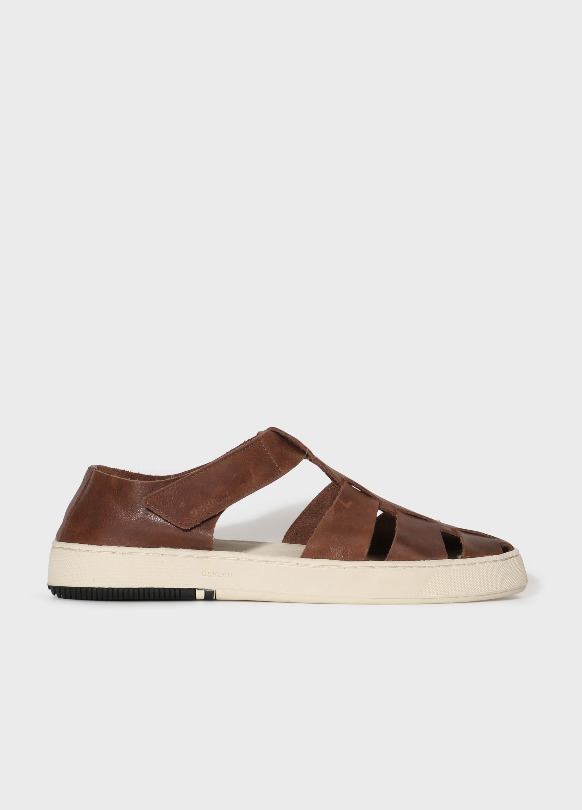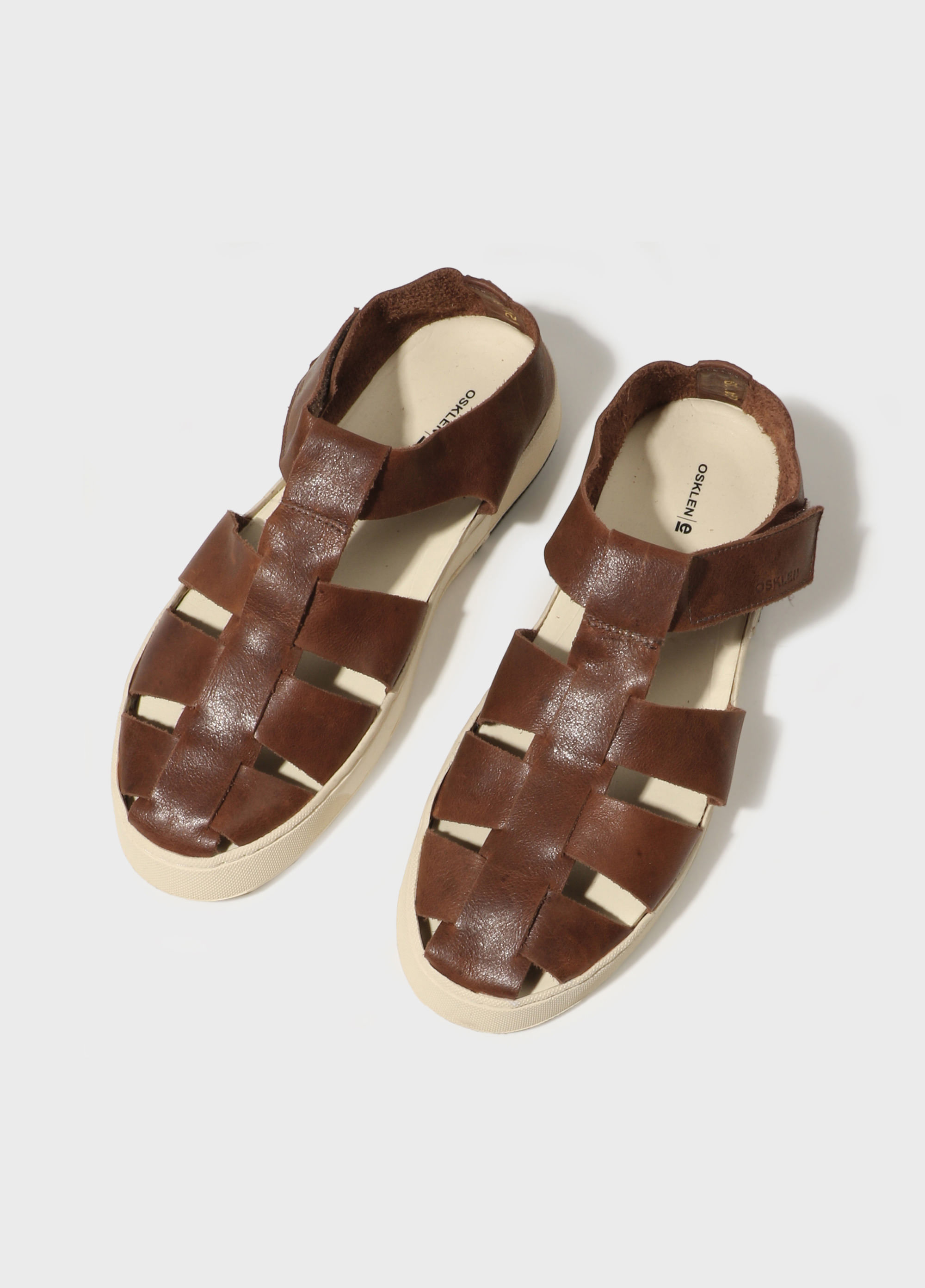 Sandália Soho em couro. Modelo de fechamento por gancho de veludo. Palmilha em EVA. Solado de borracha costurado ao cabedal com design exclusivo Osklen, produzido com no mínimo 10% de material reciclado. Produto Re-Design Waste.