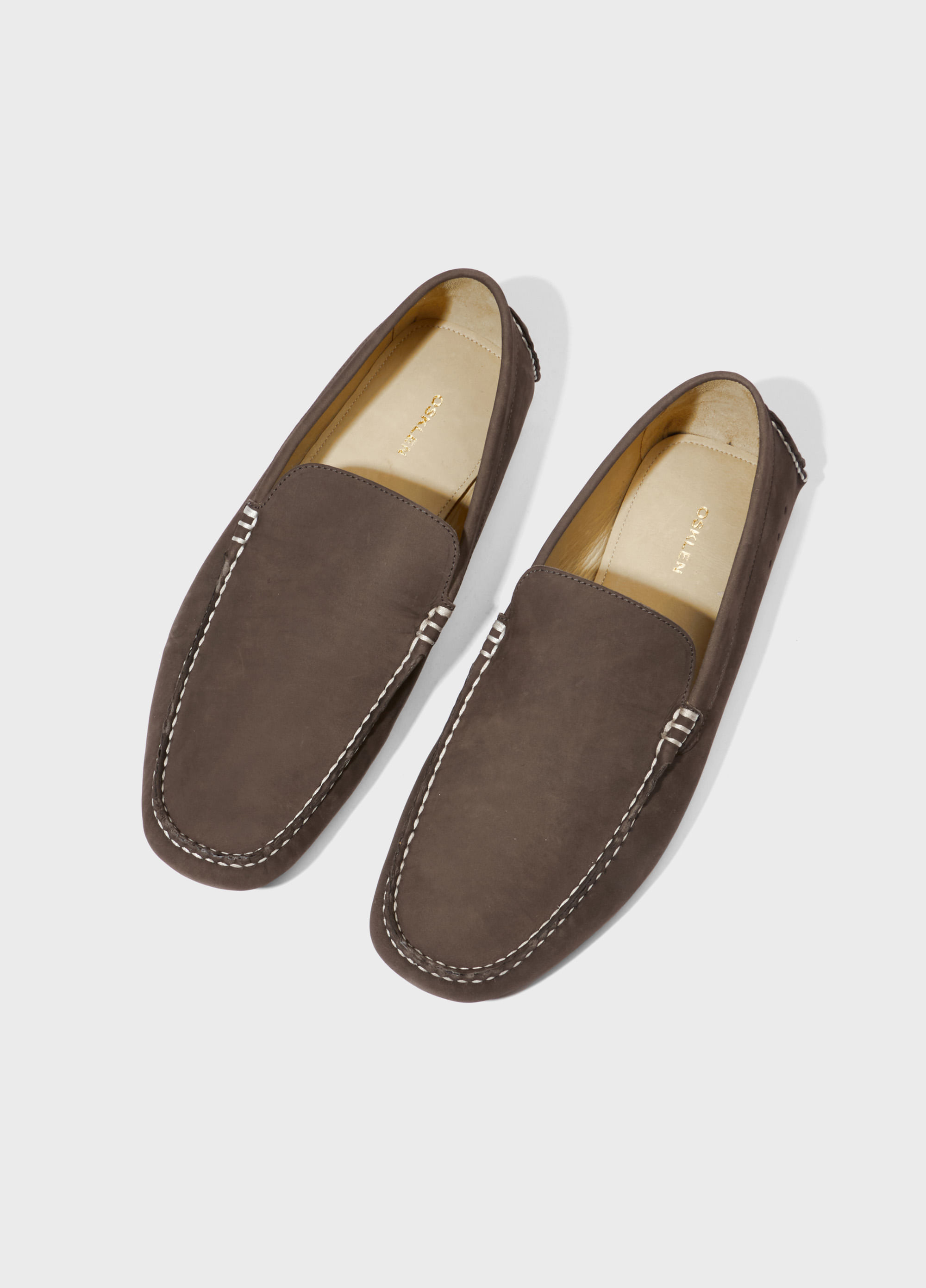 Sapato modelo driver, com cabedal em nobuck, shape desestruturado, com forro em couro mestiço com toque macio.