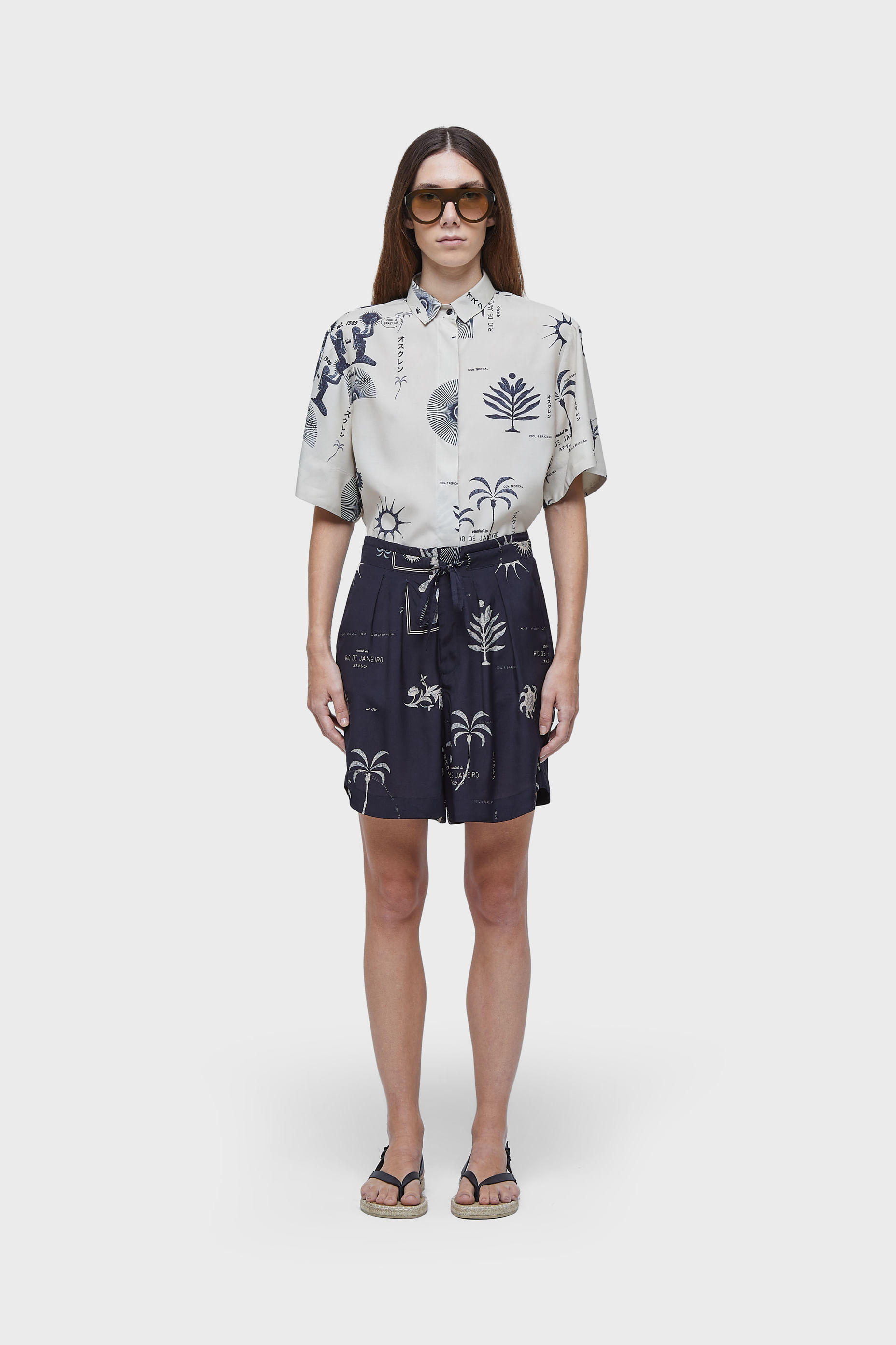 Short reto e comprimento mais comprido. Amarração no cós. Estampa exclusiba 1989. Tecido de viscose.