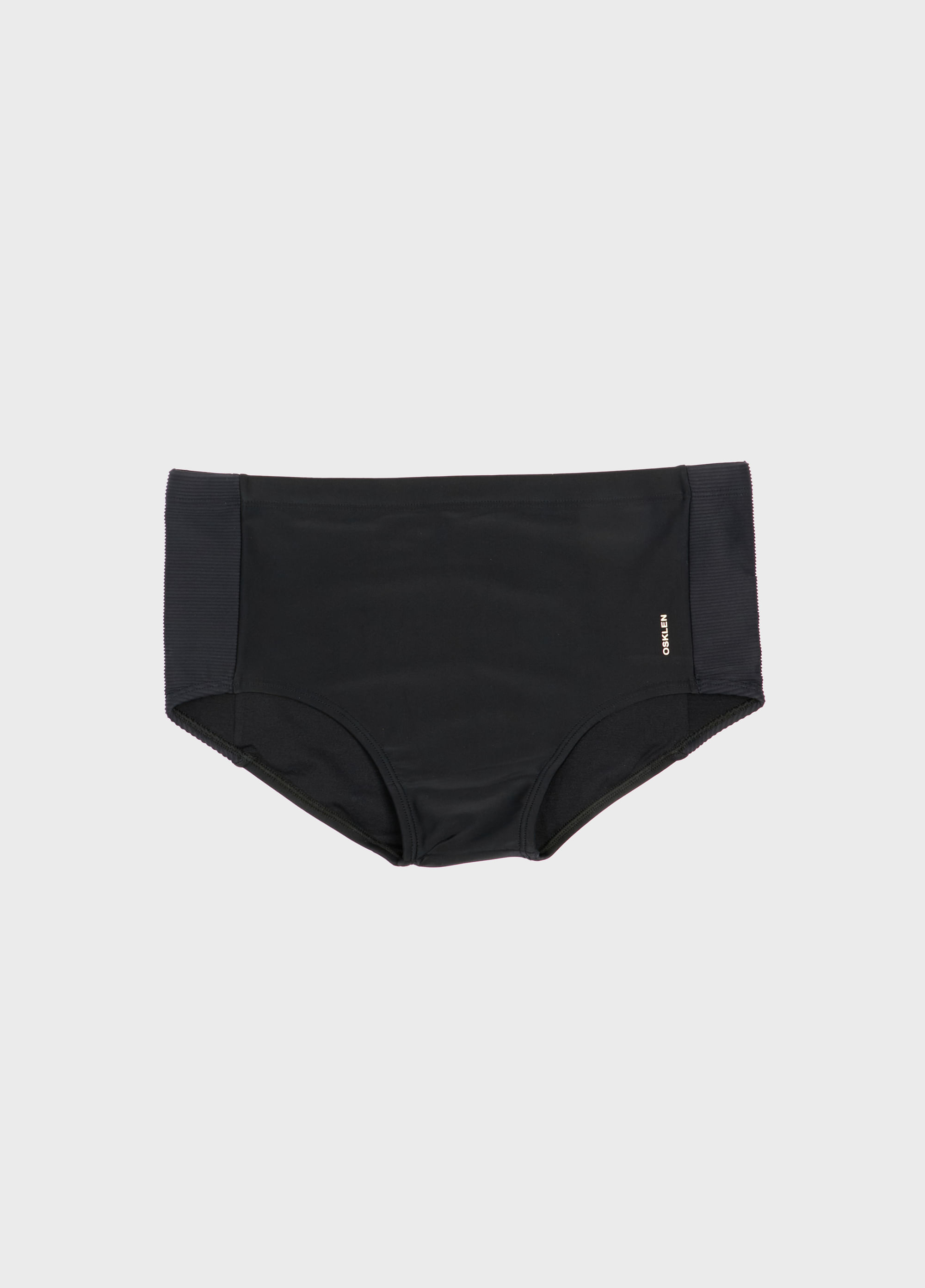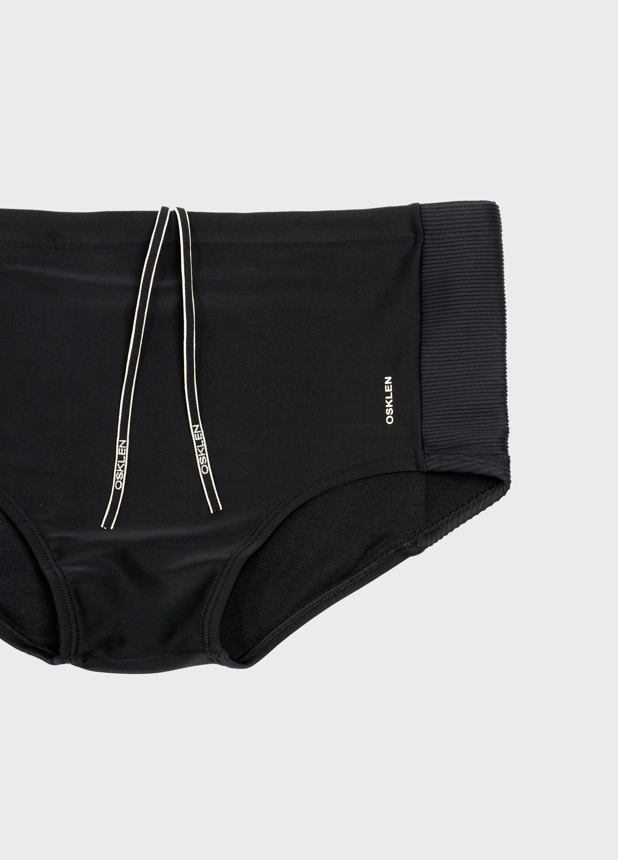 Sunga lisa em modelagem clássica, malha elástica leve e recorte lateral em malha canelada e cadarço interno regulável personalizado Osklen.