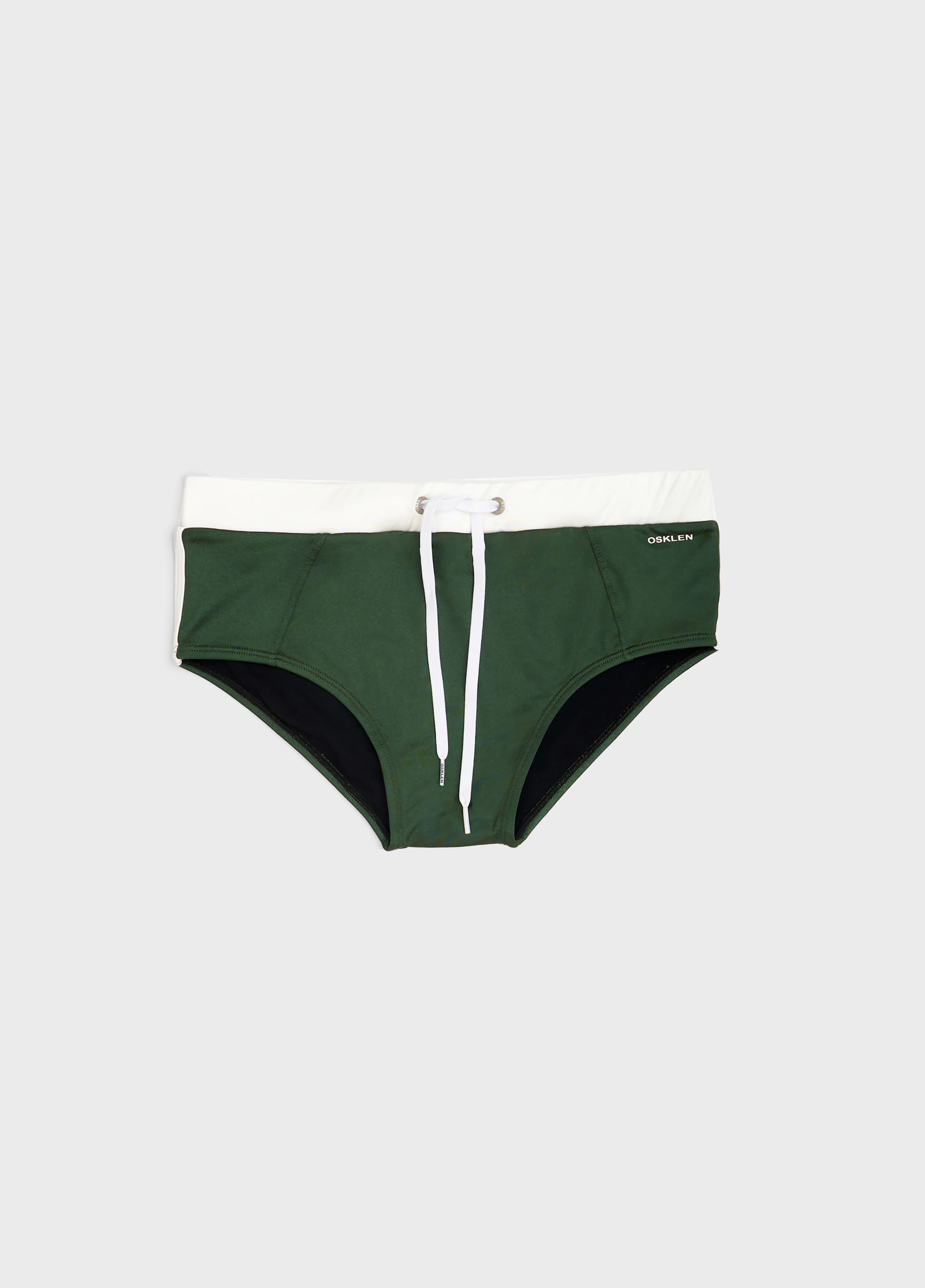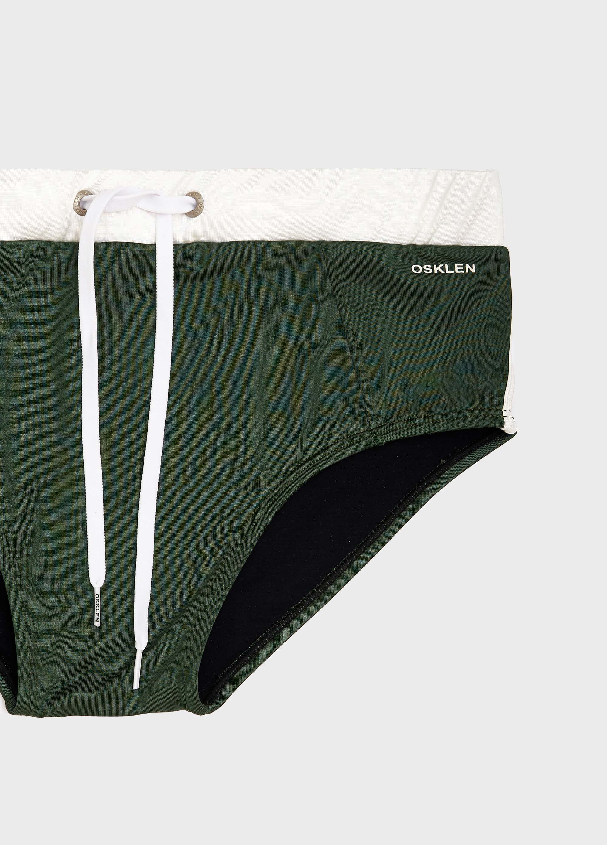 Sunga lisa em modelagem diferenciada, malha elástica leve e recorte diagonal na frente, tape lateral e cadarço regulável externo personalizado Osklen.