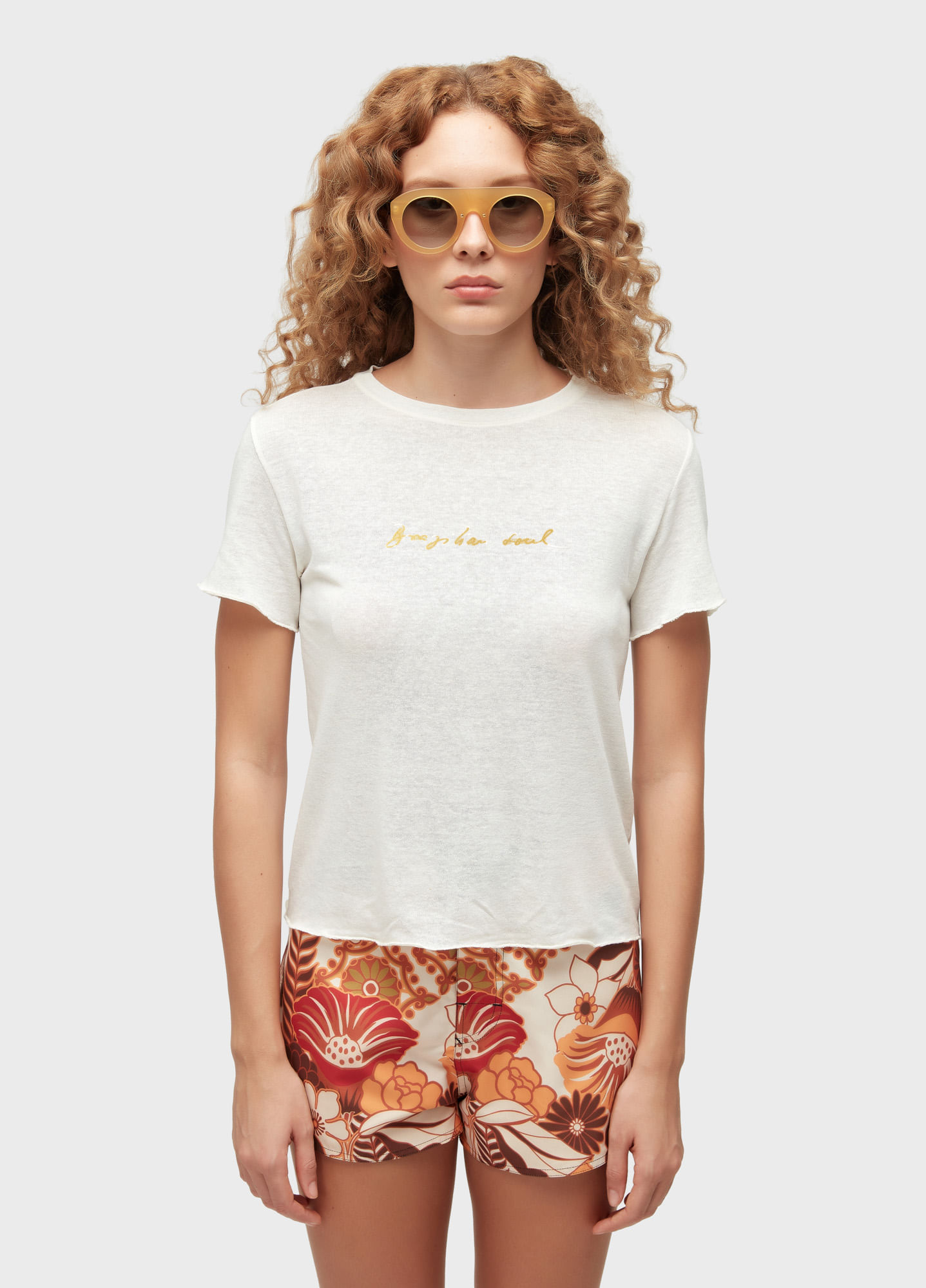 T-shirt feminina em malha de linho com viscose; Modelagem reta; Estampa Brazilian Soul em foil dourado, exclusiva Osklen. Produzida com malha de viscose. Bandeira RL - Viscose-e