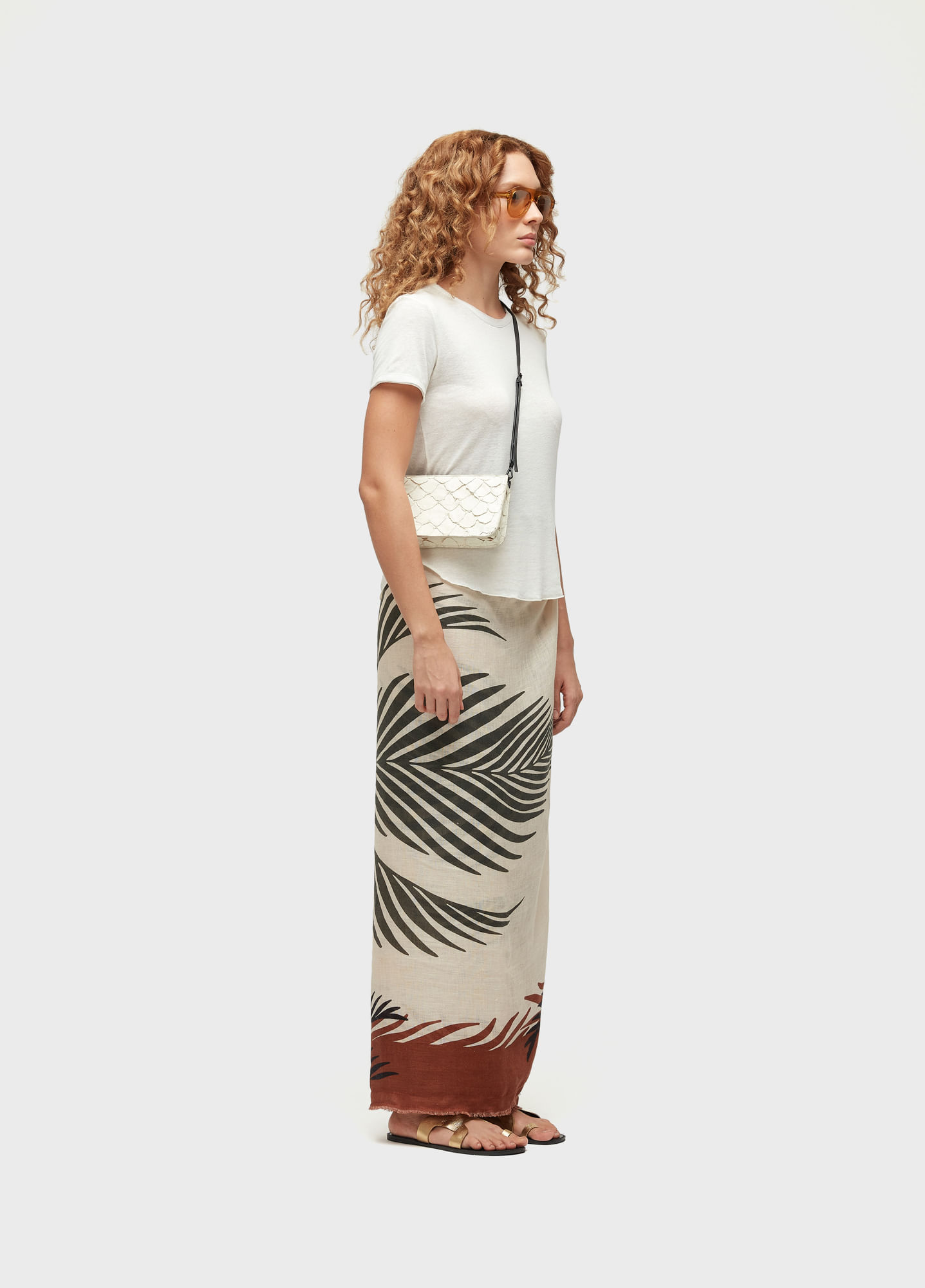 T-shirt feminina em malha de linho com viscose. Modelagem reta, solta ao corpo. Acabamentos desfiados feitos em viés aplicado de GGT de viscose. Lavada e amaciada com Menta Orgânica. BANDEIRA RL - Viscose-e