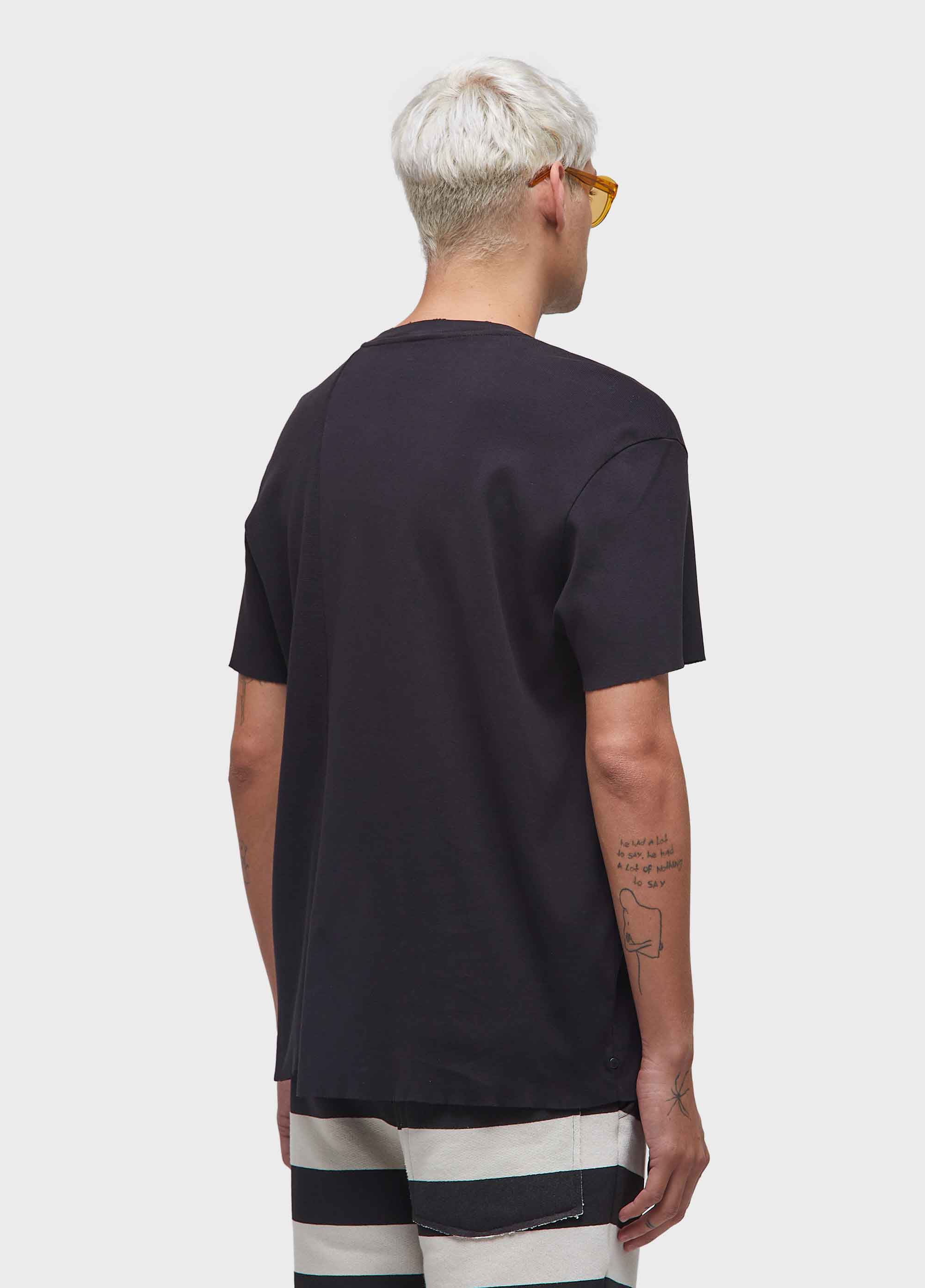 T-shirt masculina assimétrica com modelagem Regular e mix de malhas E-fabrics 100% algodão. A peça possui amaciamento Organic Mint Wash, um processo natural formulado à base do óleo essencial da menta orgânica, cultivada em pequenas hortas que fazem parte de um projeto social que promove a recuperação e ressocialização de dependentes químicos. Bandeira: Respect Our People.