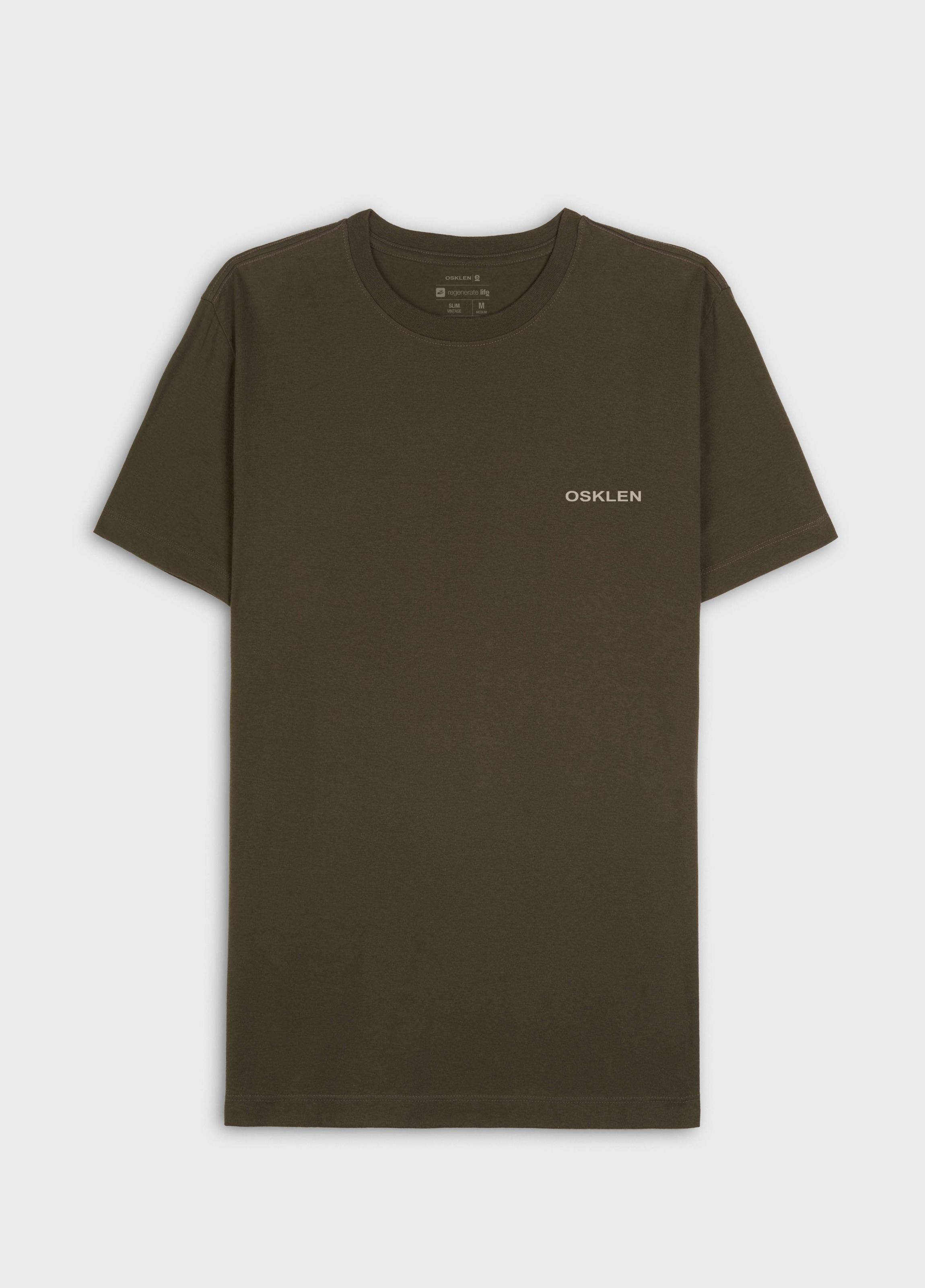 T-Shirt masculina 1/2 malha 100% algodão certificado, base de modelagem Slim, com visual gastinho, feito manualmente, peça a peça. A produção do algodão nacional certificado contribui para redução dos impactos ambientais, utiliza energia renovável, reduz o consumo de água e fomenta o aprimoramento social e ambiental das cadeias produtivas brasileiras. Bandeira Regenerate Life.