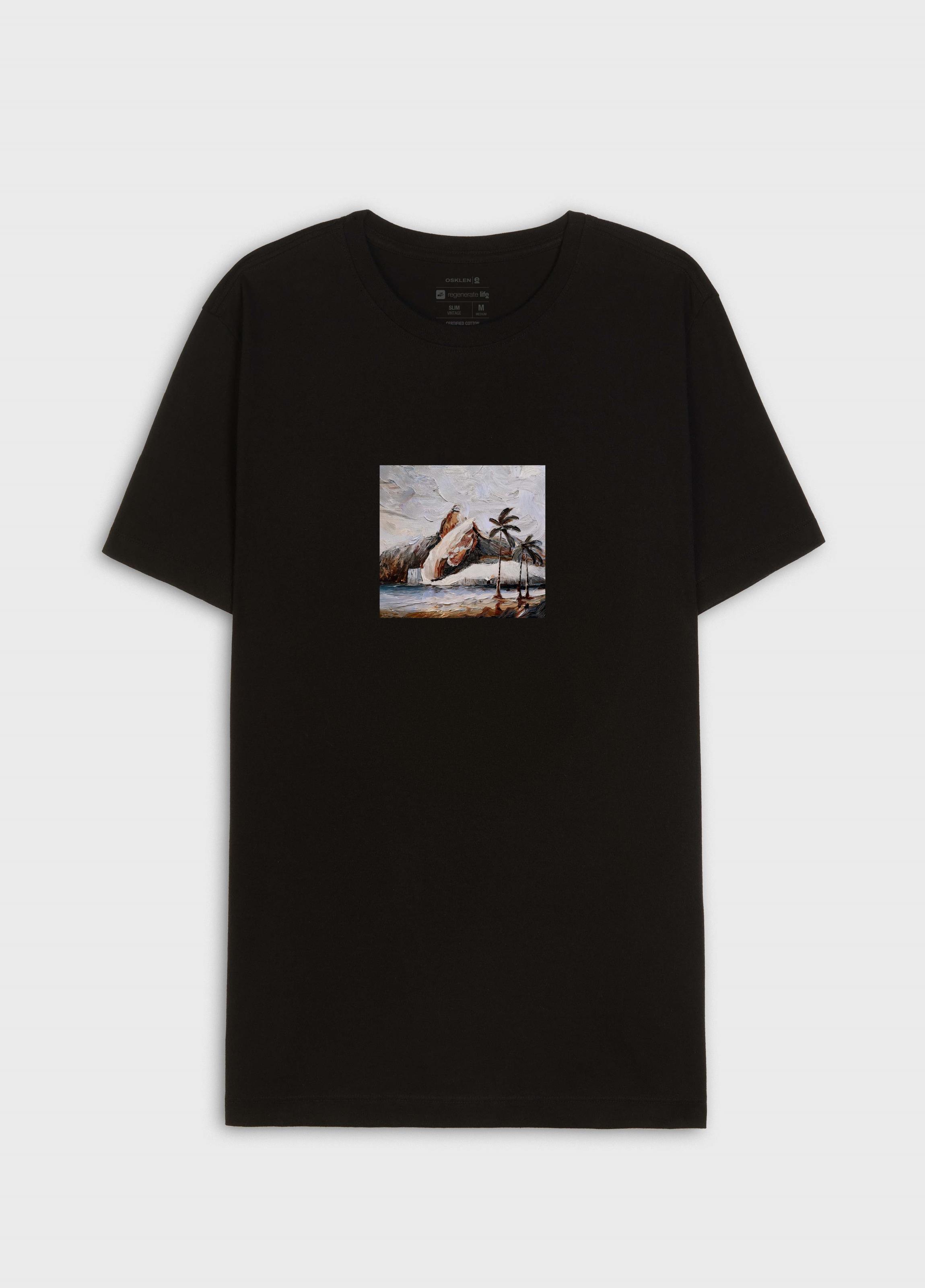 T-Shirt masculina 1/2 malha 100% algodão certificado, base de modelagem Slim, com visual gastinho, feito manualmente, peça a peça. A produção do algodão nacional certificado contribui para redução dos impactos ambientais, utiliza energia renovável, reduz o consumo de água e fomenta o aprimoramento social e ambiental das cadeias produtivas brasileiras. Bandeira Regenerate Life.