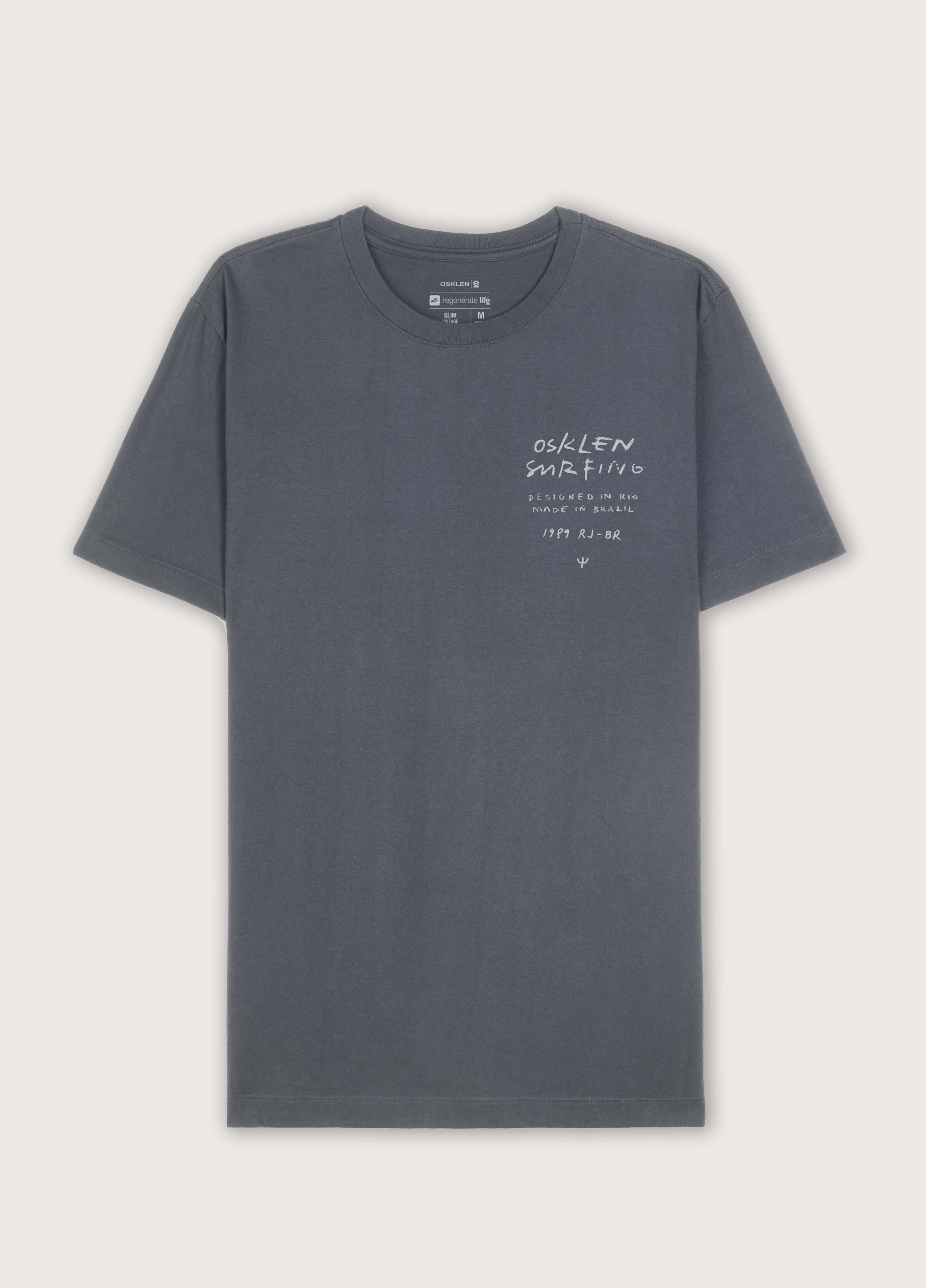 T-Shirt masculina 1/2 malha 100% algodão certificado, base de modelagem Slim, com visual gastinho, feito manualmente, peça a peça. A produção do algodão nacional certificado contribui para redução dos impactos ambientais, utiliza energia renovável, reduz o consumo de água e fomenta o aprimoramento social e ambiental das cadeias produtivas brasileiras. Bandeira Regenerate Life.