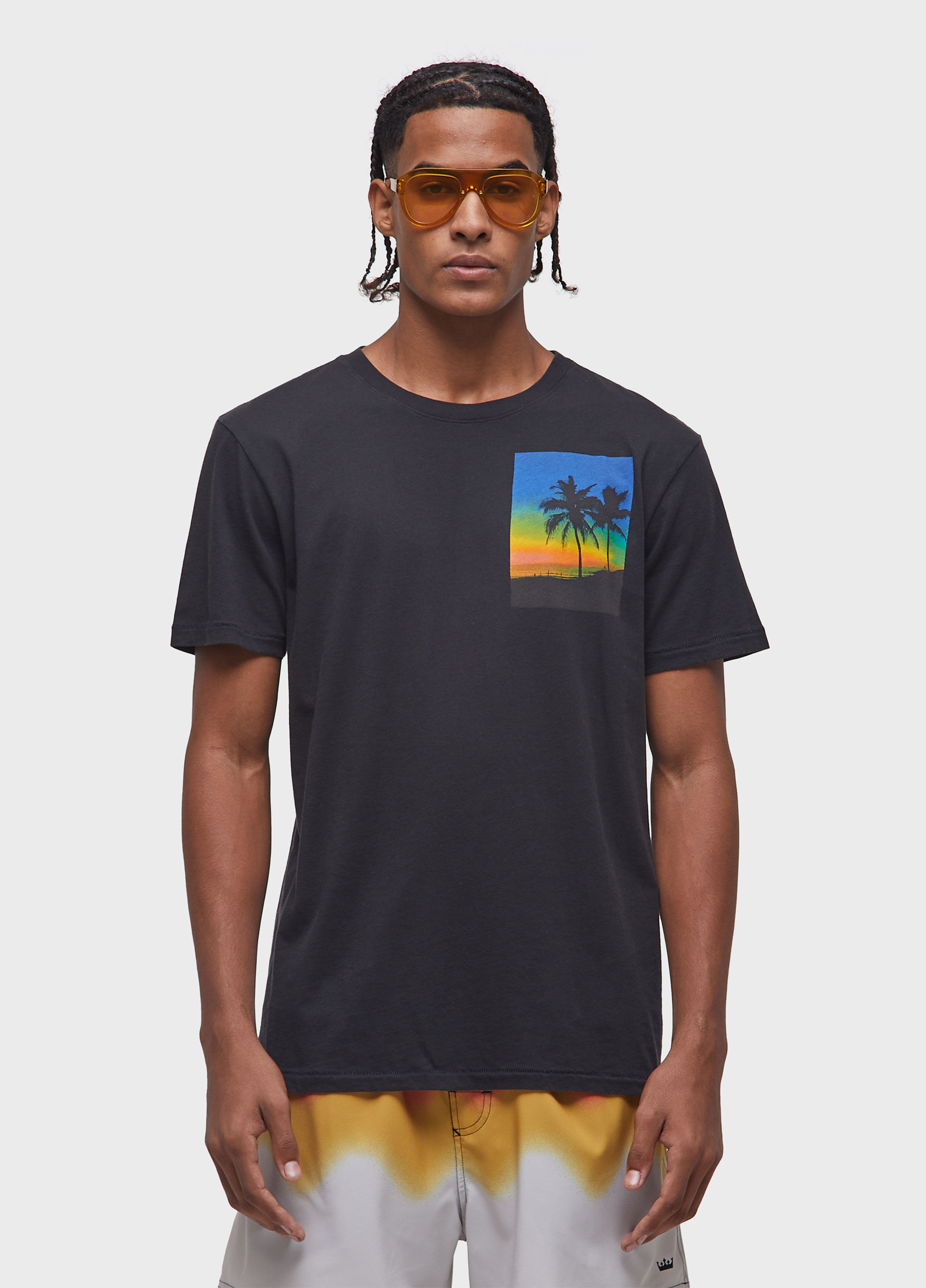 T-Shirt masculina de modelagem fit, ajustada ao corpo. Malha leve de algodão peruano com toque macio. Estampa Exclusiva Sunset. Peça delicada sujeita a variação de medida, atenção aos cuidados informados na etiqueta de composição. Lavar peça na água fria e não usar secadora.