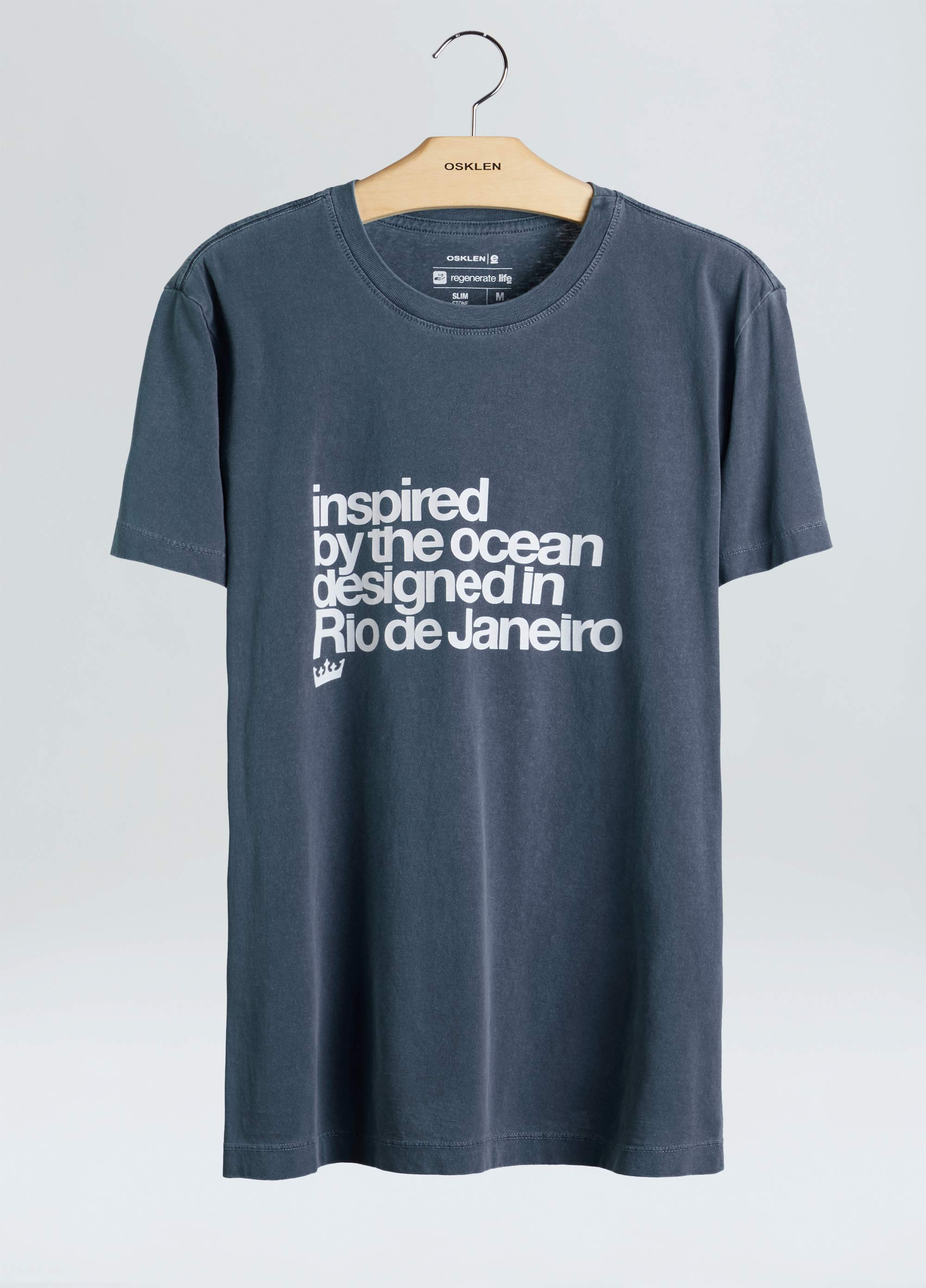 T-Shirt masculina 1/2 malha 100% algodão certificado, base de modelagem Slim, visual lavado, gastinha. A produção do algodão nacional certificado contribui para redução dos impactos ambientais, utiliza energia renovável, reduz o consumo de água e fomenta o aprimoramento social e ambiental das cadeias produtivas brasileiras. Bandeira Regenerate Life.