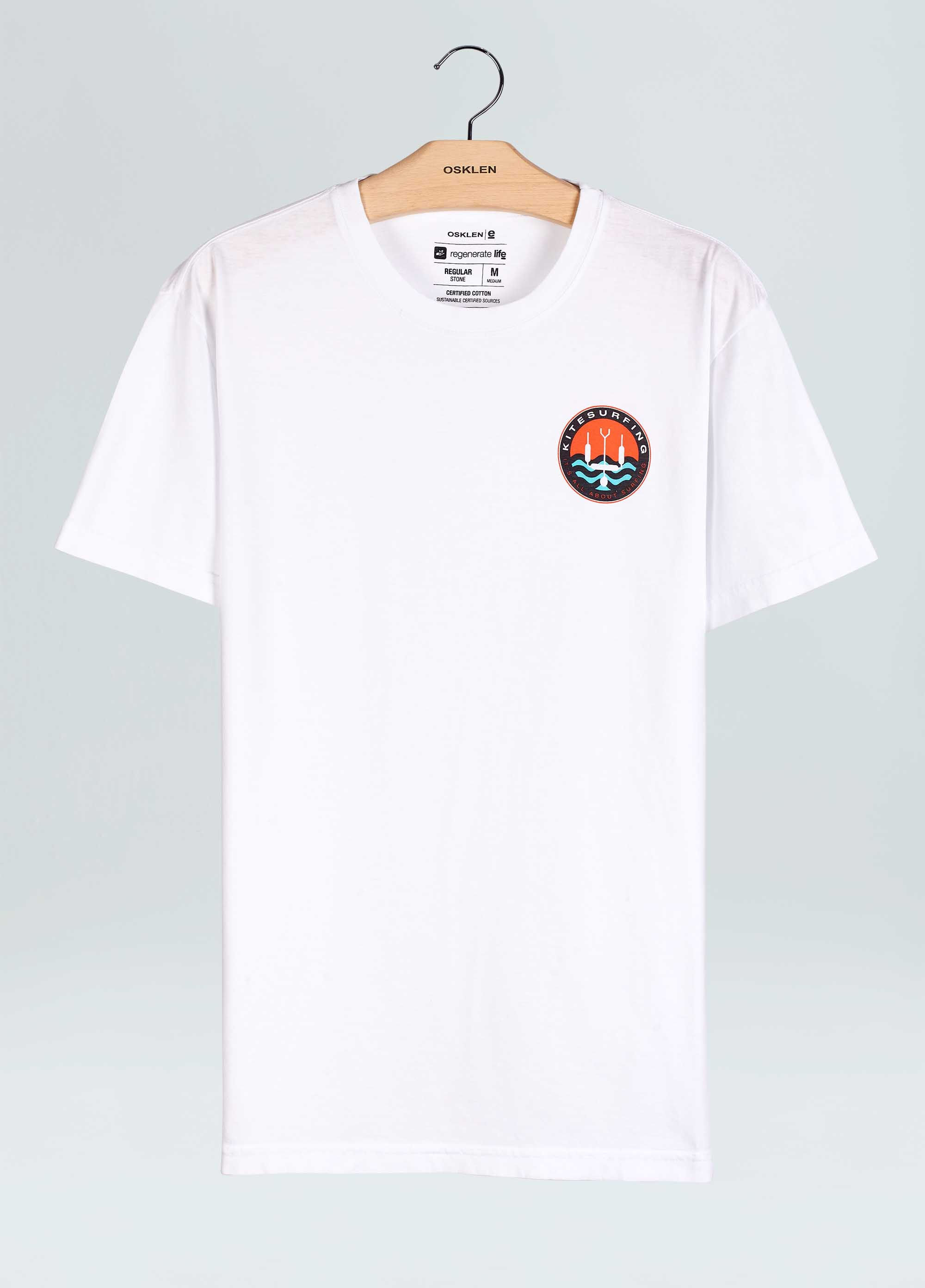 T Shirt masculina 1/2 malha 100% algodão certificado, base de modelagem Regular. Bandeira Regenerate Life. A produção do algodão nacional certificado contribui para redução dos impactos ambientais, utiliza energia renovável, reduz o consumo de água e fomenta o aprimoramento social e ambiental das cadeias produtivas brasileiras.
