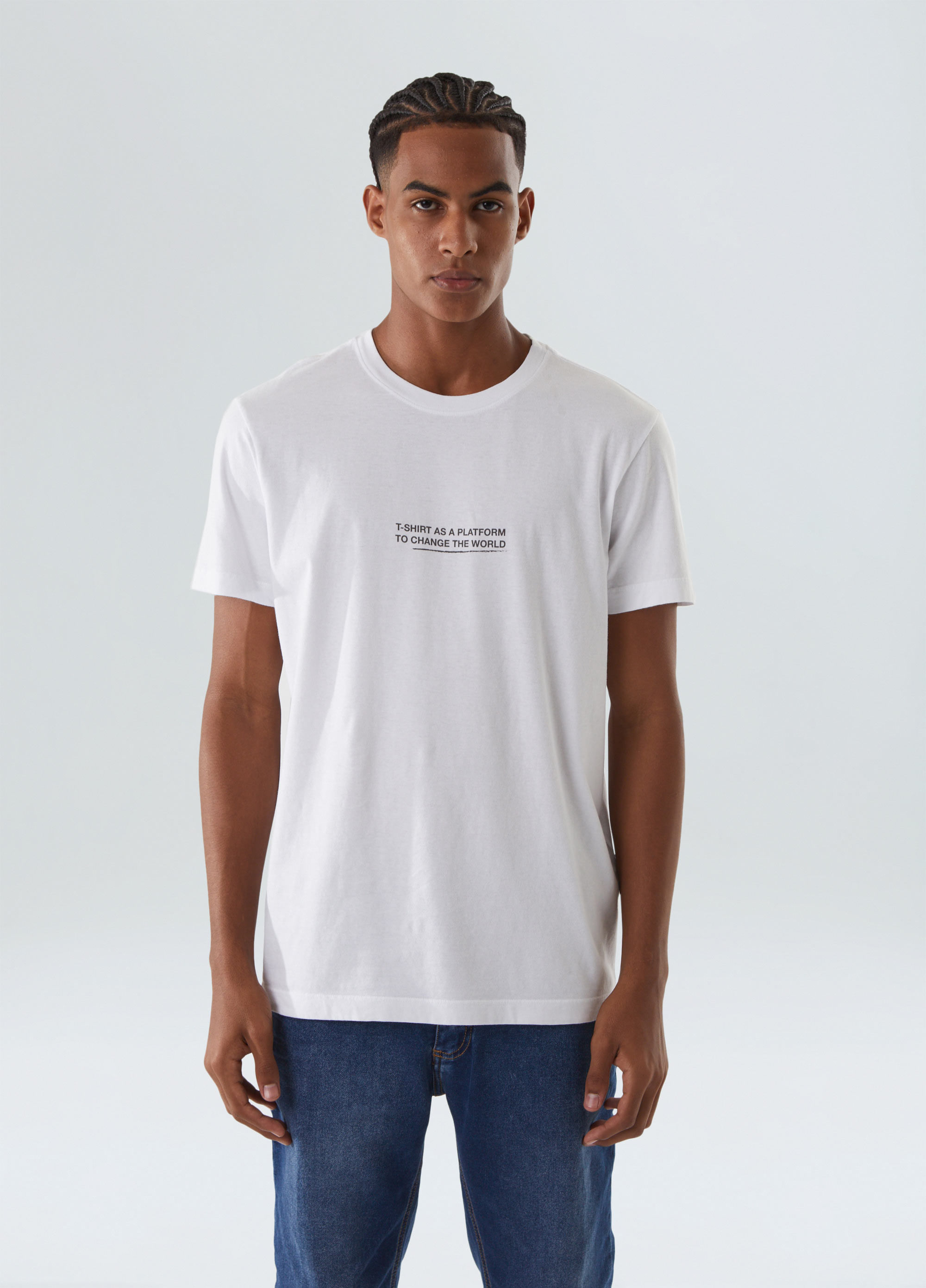 T-Shirt masculina 1/2 malha 100% algodão certificado, base de modelagem Slim, visual lavado, gastinha. A produção do algodão nacional certificado contribui para redução dos impactos ambientais, utiliza energia renovável, reduz o consumo de água e fomenta o aprimoramento social e ambiental das cadeias produtivas brasileiras. Bandeira Regenerate Life.