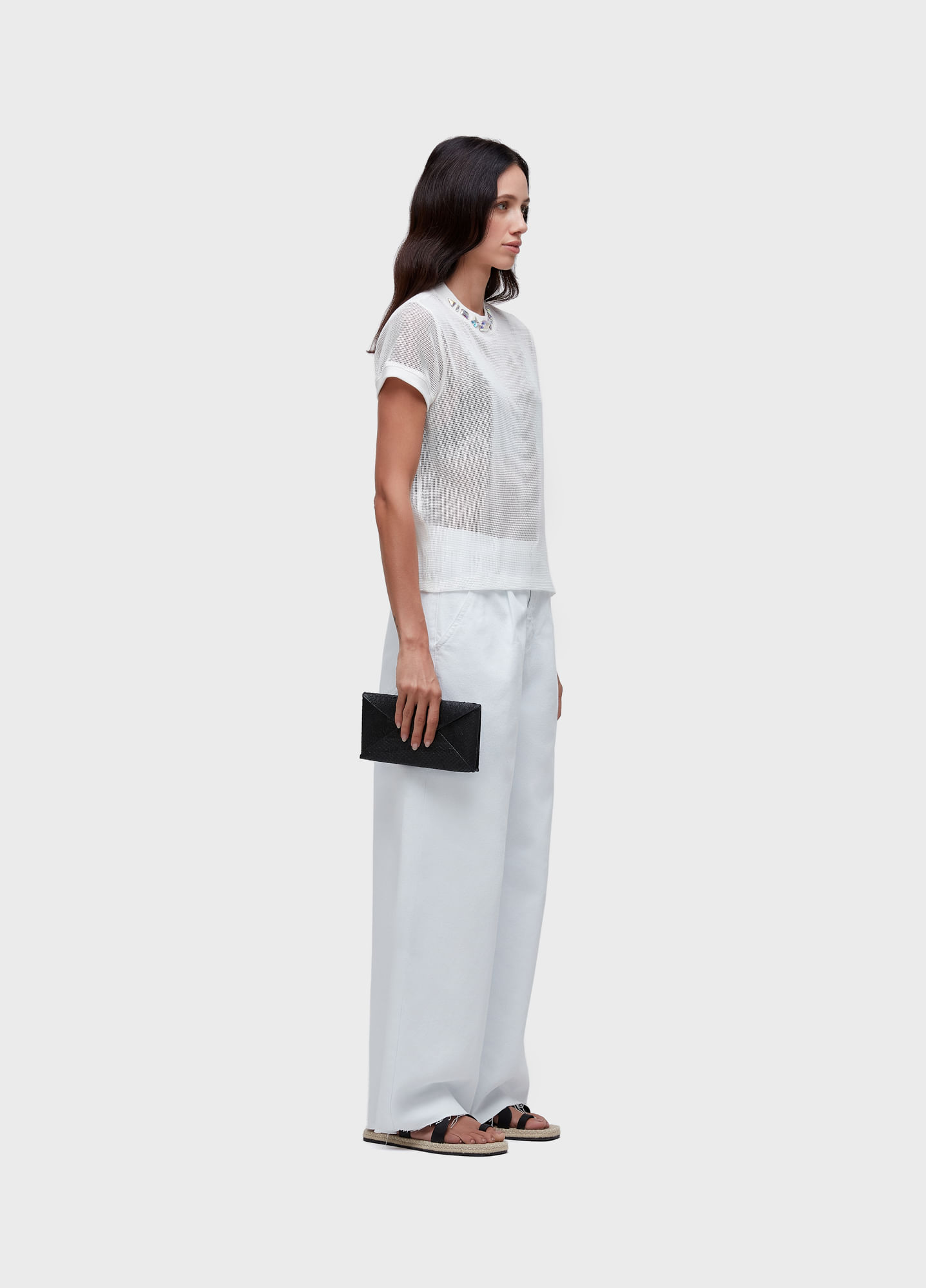 T-shirt feita em tela de algod?o com aplicação de pedras Swarovski na gola; Modelagem regular, ombros e cavas no lugar; Peça Transparente.