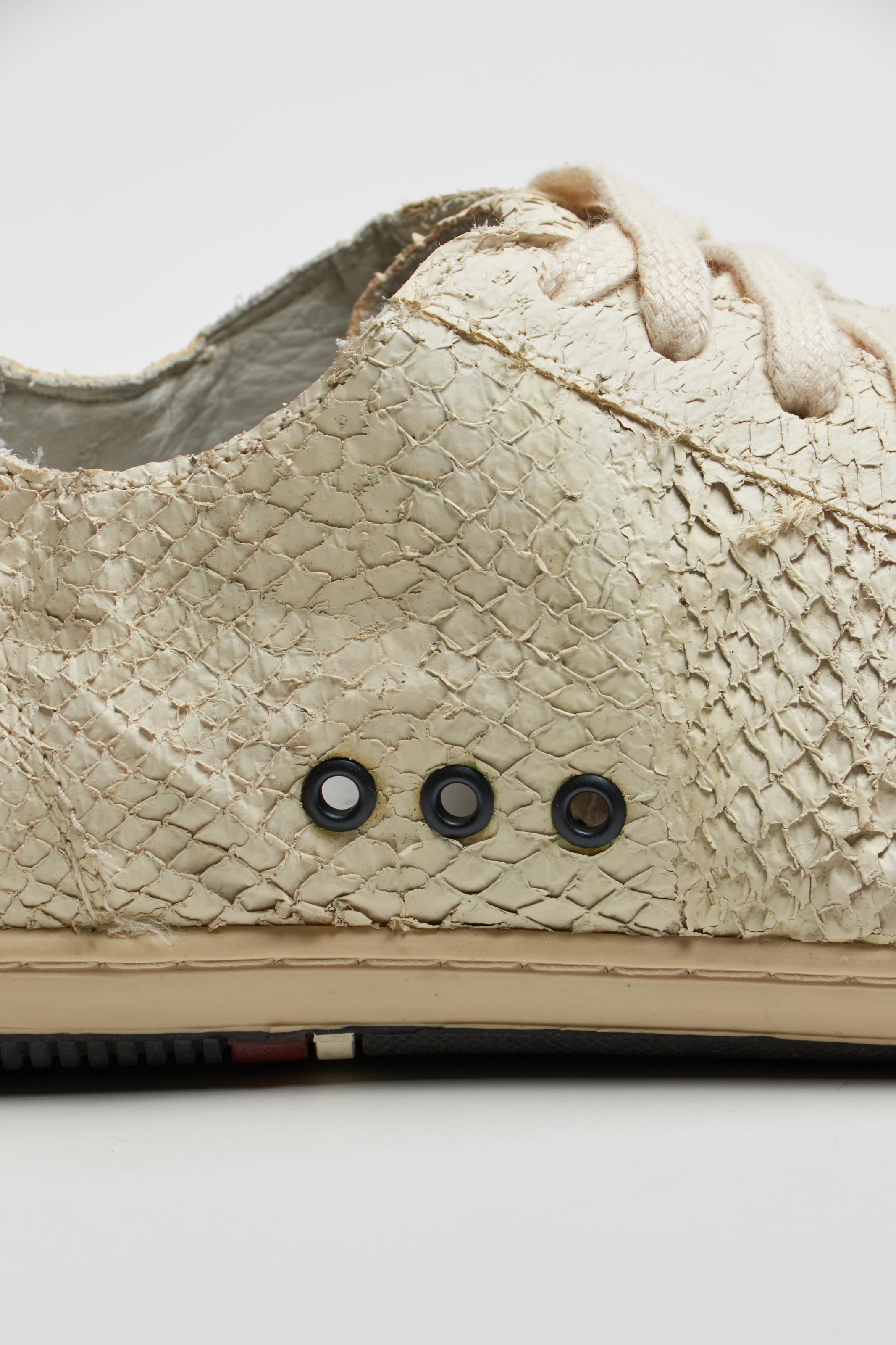 Tênis em couro de salmão. Modelo de amarração com cadarço de algodão. Forro e palmilha em couro bovino. Solado FLow em borracha costurado ao cabedal com design exclusivo Osklen, produzido com no mínimo 10% de material reciclado. Produto Re-Design Waste.