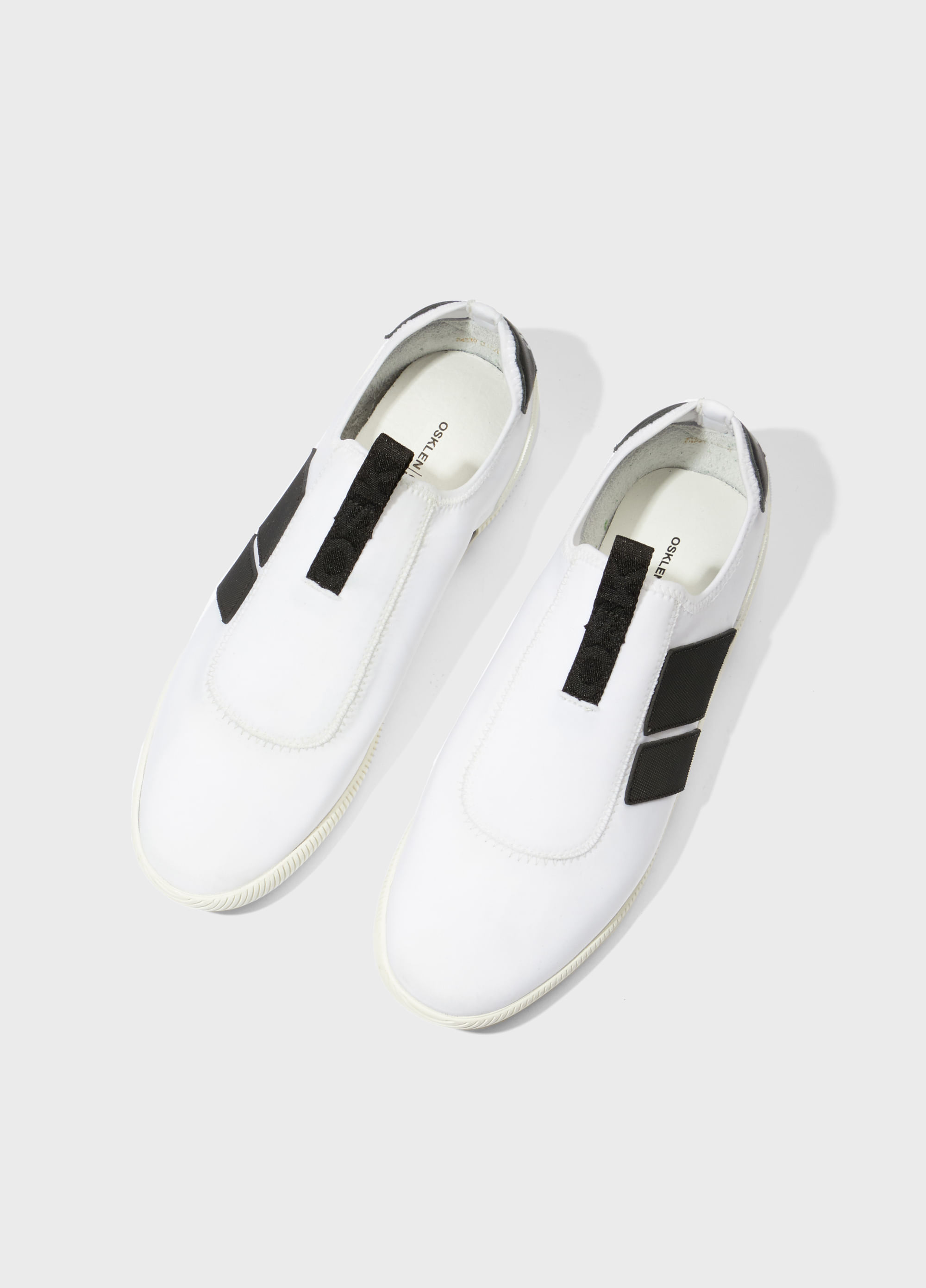 Tênis Arpoador em material elástico. Modelo slip on. Pamilha em couro. Solado de borracha costurado ao cabedal com design exclusivo Osklen, produzido com no mínimo 10% de material reciclado. Produto Re-Design Waste.