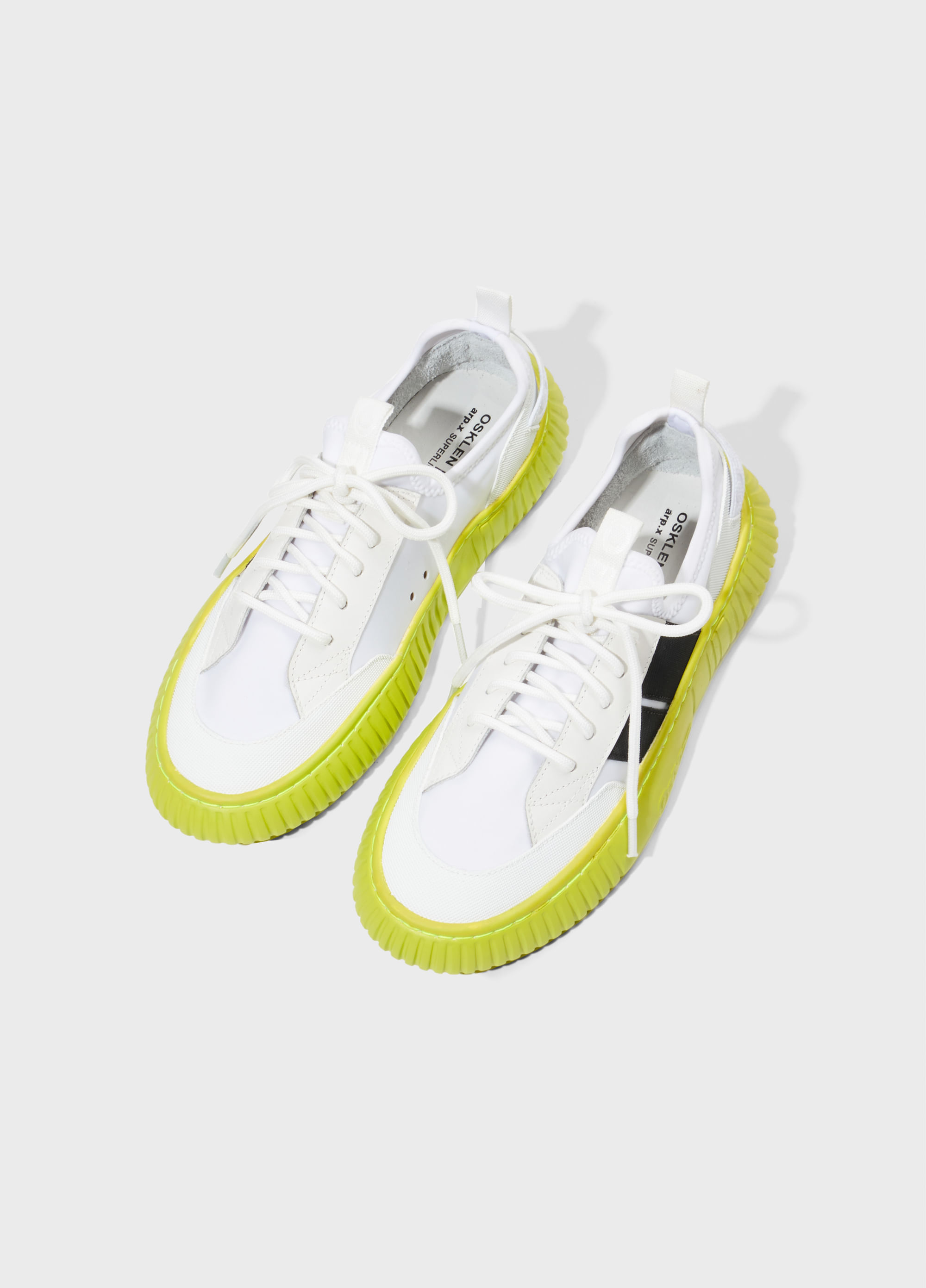 Tênis Arp(X) em material elástico com recortes de borracha texturizada no bico, lateral e na traseira. Modelo de amarração com cadarço de corda esportiva e detalhe em couro. Forro parcial e palmilha em couro. Solado com EVA Verde costurado ao cabedal com design exclusivo Osklen, produzido com carbono de base biológica, oriundo da cana de açúcar plantada e cultivada no Brasil. Produto Regenerate Life.