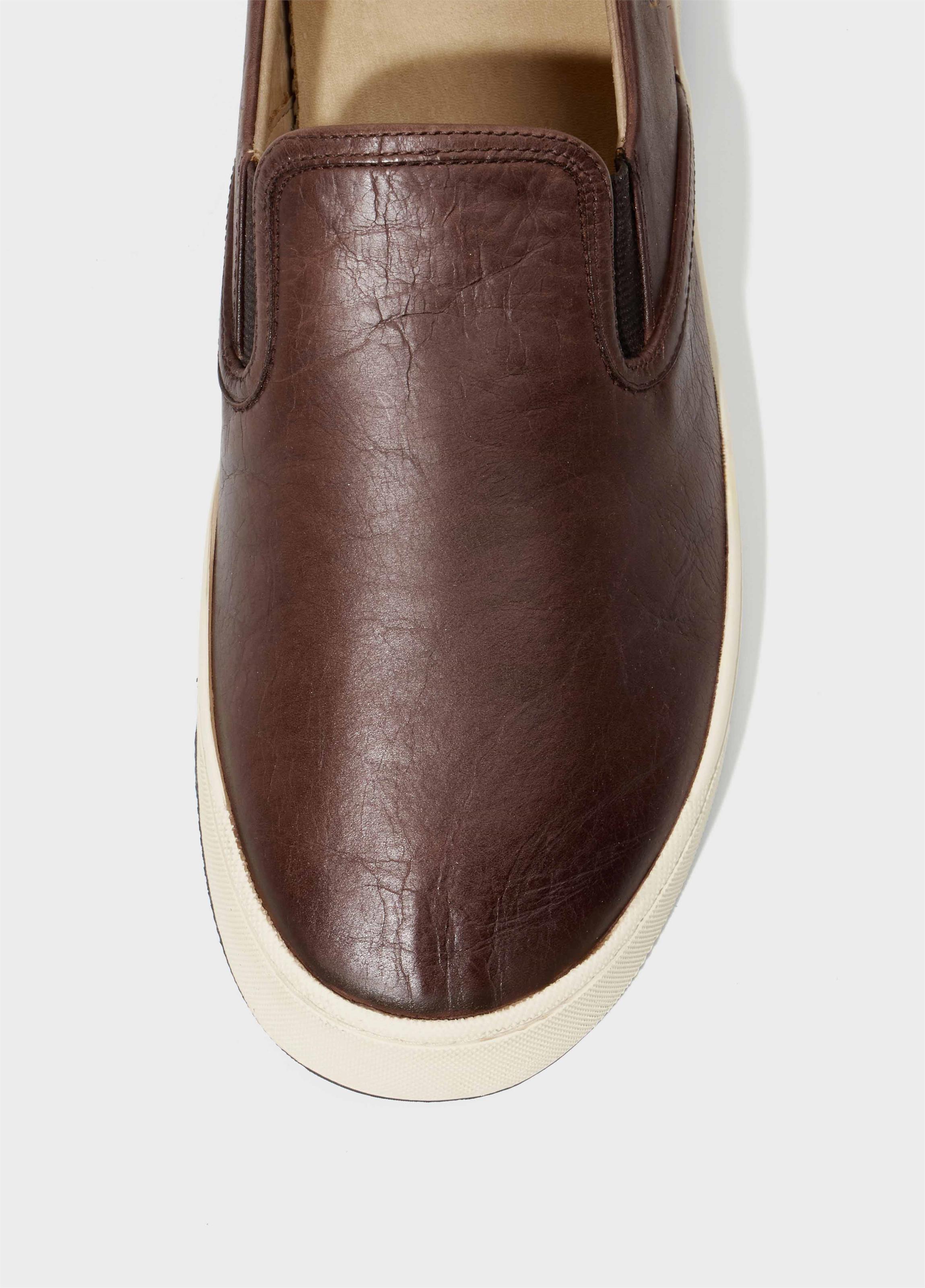 Tênis Soho Bossanova em couro bovino com visual envelhecido. Modelo slip on com elásticos para facilitar o calce. Forro e palmilha em couro bovino. Solado de borracha costurado ao cabedal com design exclusivo Osklen. Produto Re-Design Waste. A partir do