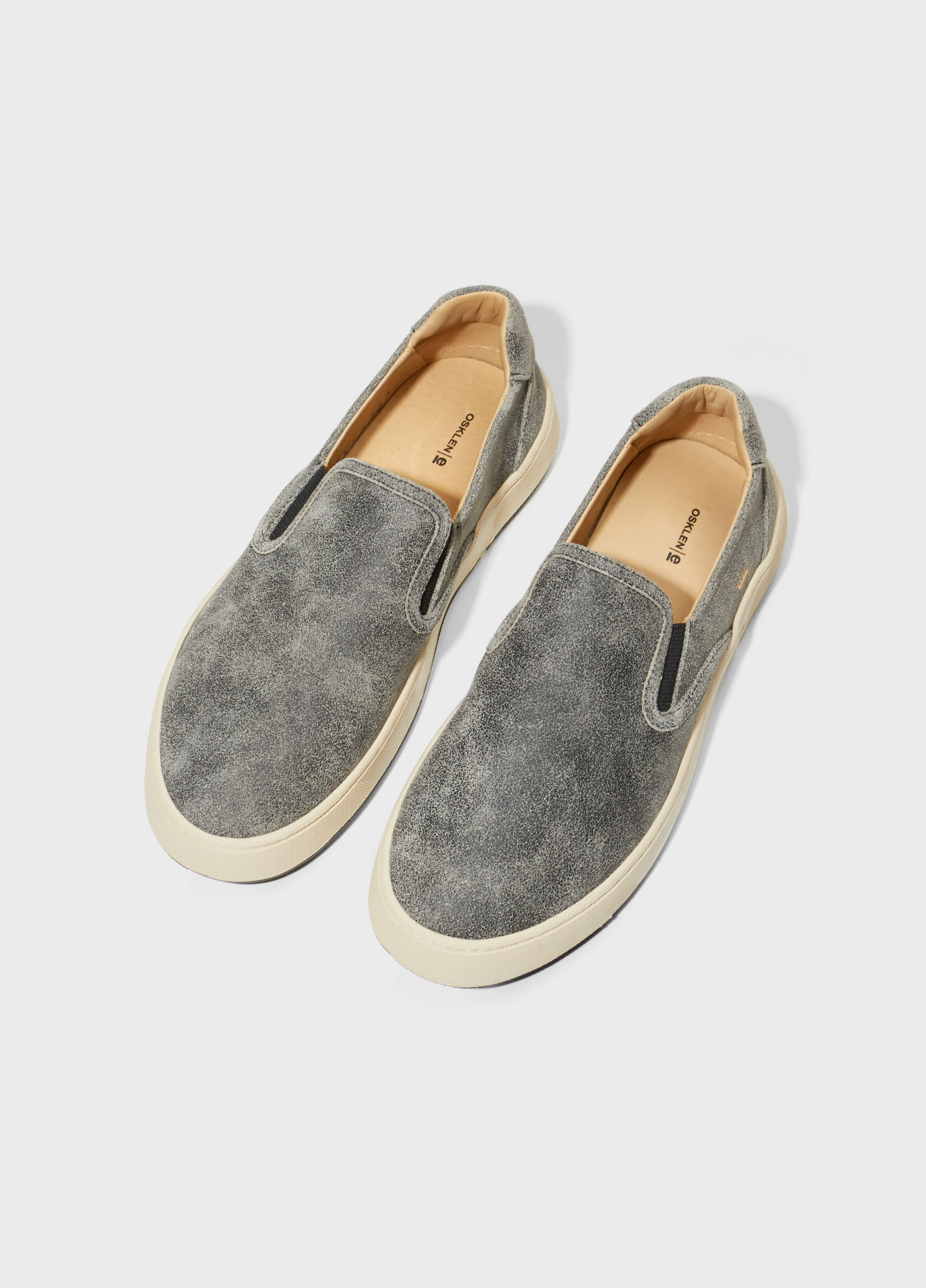 Tênis Soho Bossanova em couro com visual gasto. Modelo slip on com elásticos para facilitar o calce. Forro e palmilha em couro. Solado de borracha costurado ao cabedal com design exclusivo Osklen. Produto Re-Design Waste. A partir do Inverno 21 o solado passou a ser produzido com no mínimo 10% de material reciclado.