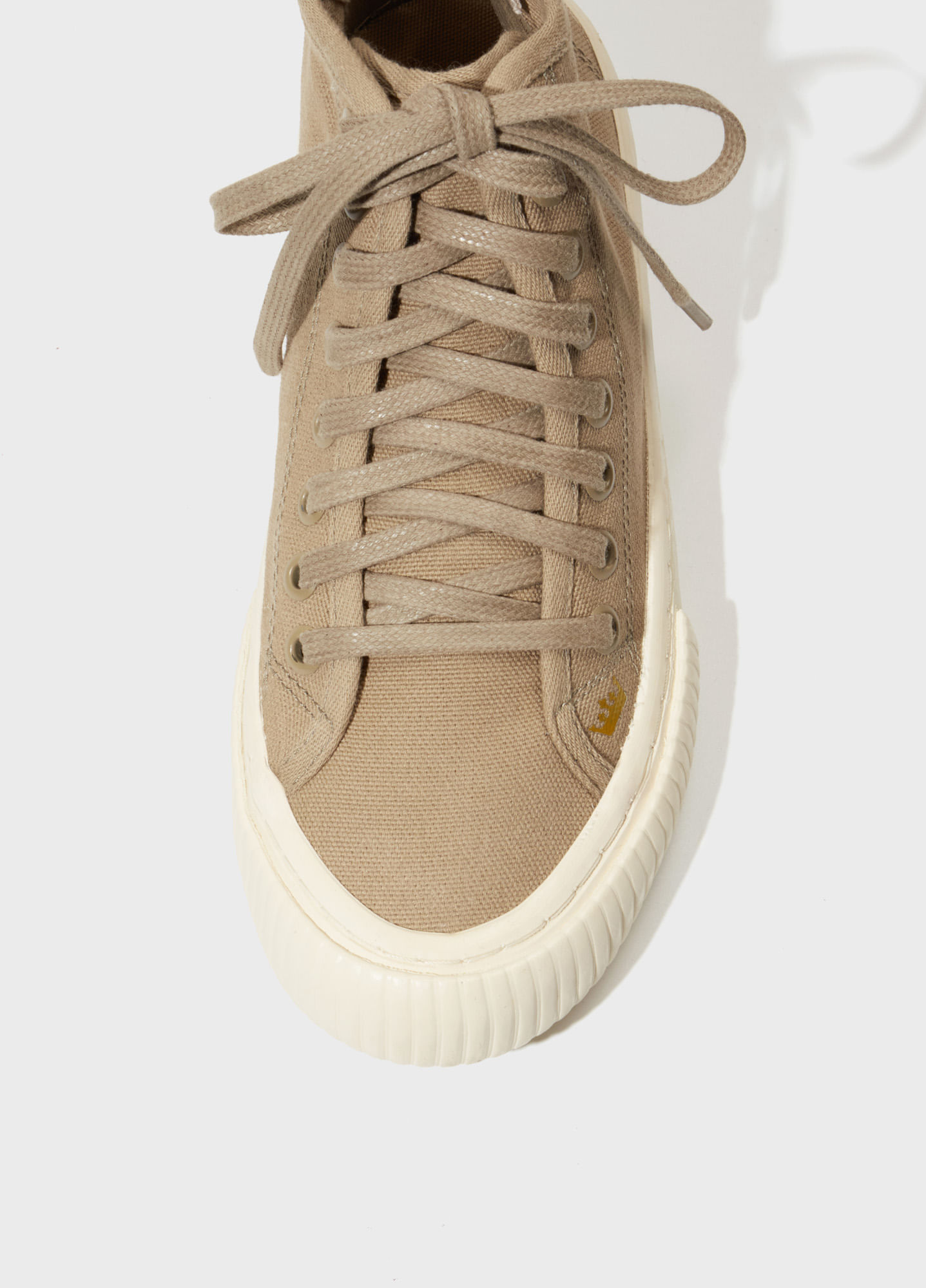 Tênis vulcanizado cano alto com cabedal em lona. Modelo de amarração com cadarço de algodão. Forro e palmilha em algodão. Solado de borracha com fundo simulando o calçadão de Ipanema com design exclusivo Osklen. A partir do Inverno 21 o solado passou a ser produzido com no mínimo 10% de material reciclado.