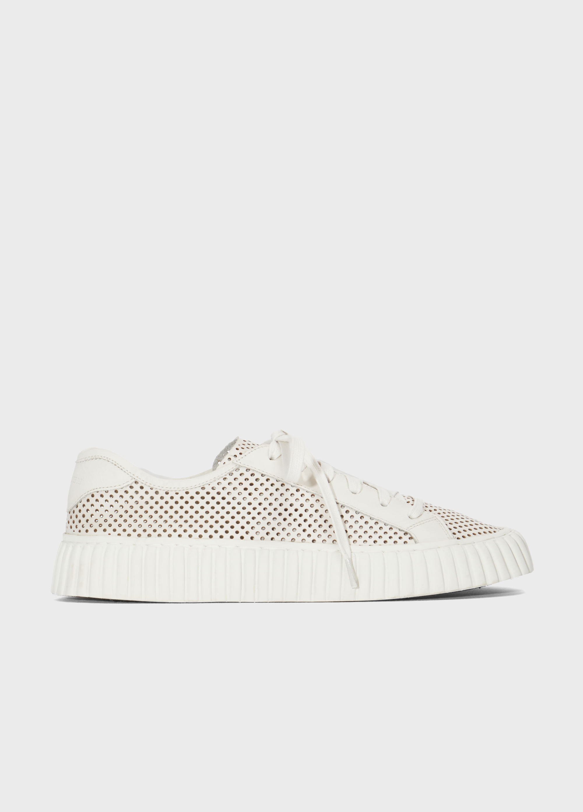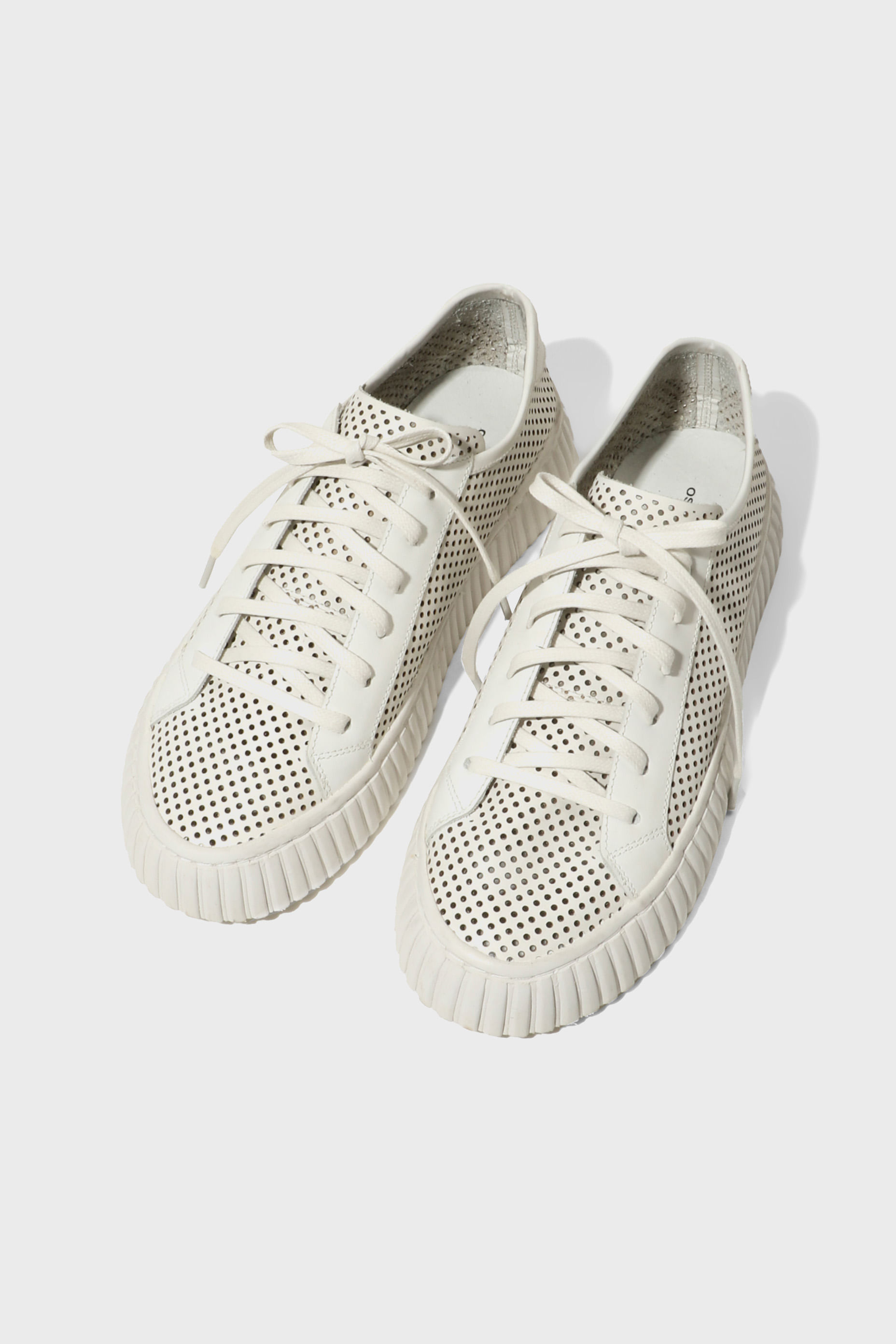 Tênis vulcanizado em couro com microfuros feitos a laser. Modelo de amarração com cadarço de algodão. Forro e palmilha em couro. Solado flatform de borracha costurado ao cabedal com design exclusivo Osklen, produzido com no mínimo 10% de material reciclado. Produto Re-Design Waste.
