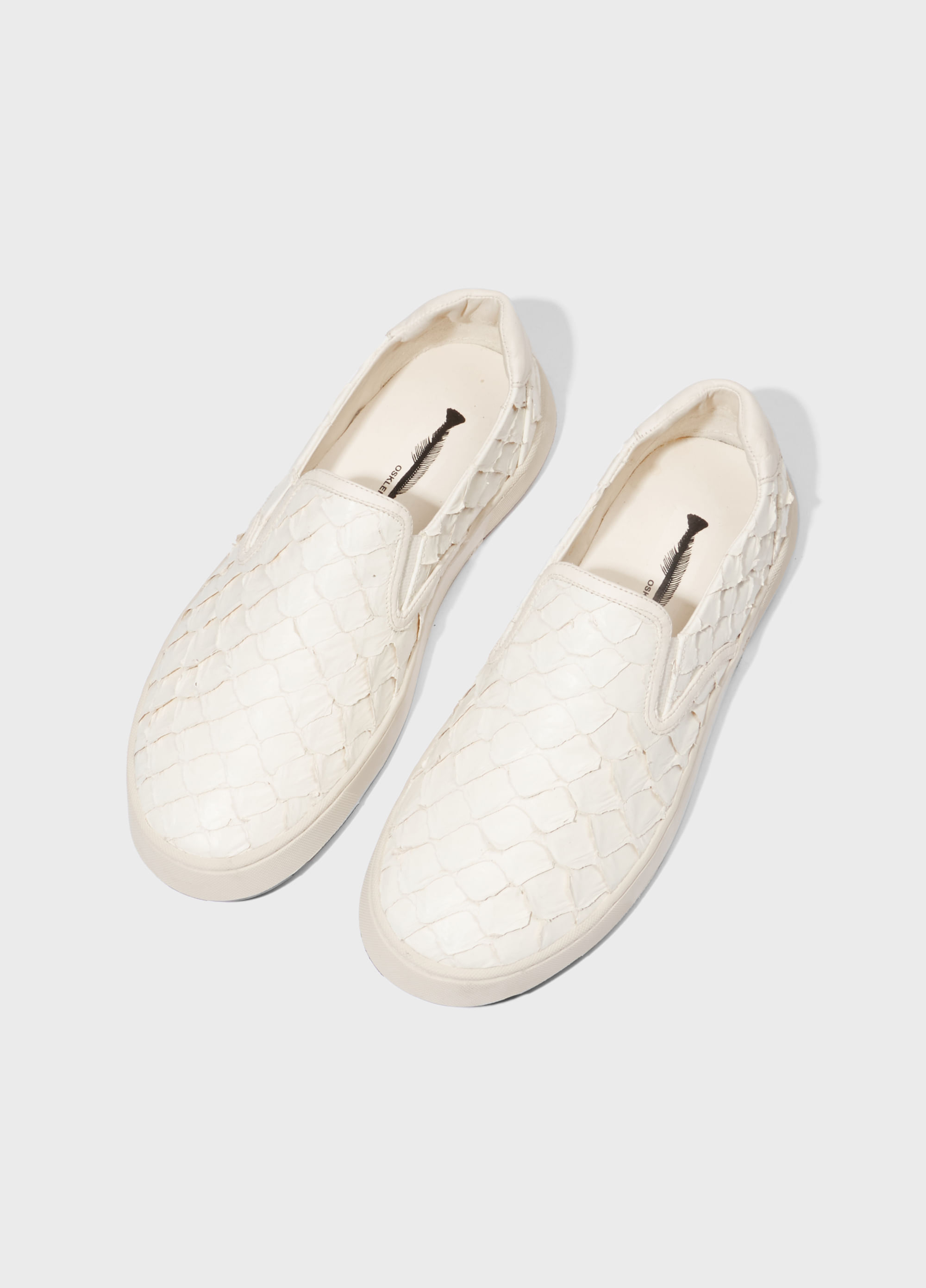 Tênis Soho Bossanova em couro de Pirarucu. A pele do peixe Pirarucu usada pela Osklen atende às normas rigorosas de Manejo Sustentável e protege a espécie do risco de extinção, além da própria floresta já que não envolve desmatamento. Modelo slip on com elásticos para facilitar o calce. Forro e palmilha em couro bovino. Solado de borracha costurado ao cabedal com design exclusivo Osklen, produzido com no mínimo 10% de material reciclado. Produto Re-Design Waste e Regenerate Life.