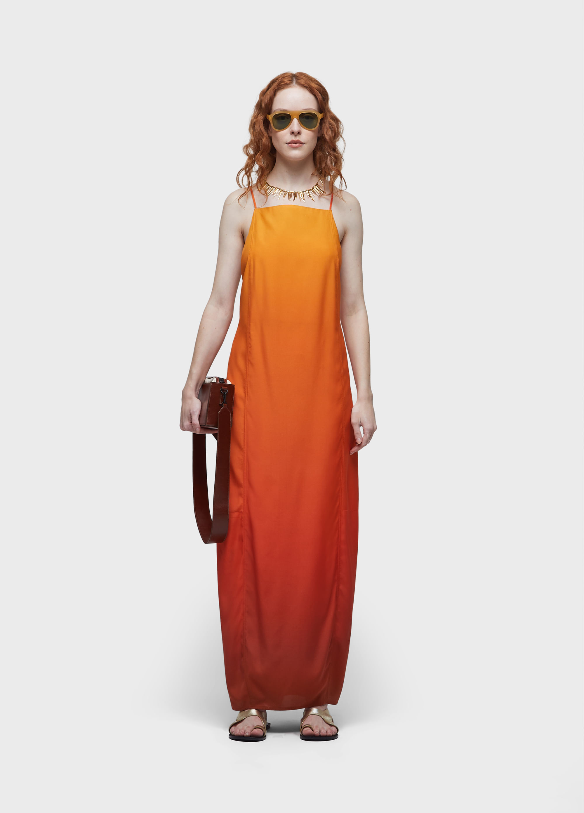 Vestido, midi, alcas finas, decote reto, shape baloon, estampa sunset, linho com viscose