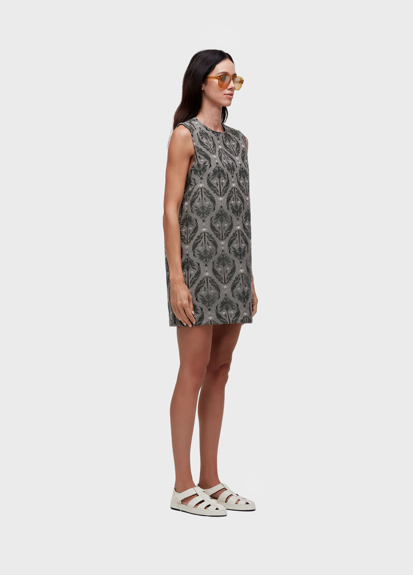 Vestido curto. Feminino. Algodao com poliester. Slveeveless, acabamento desfiado na barra/cava/decote, ziper no centro costas, double face. Estampa imperial