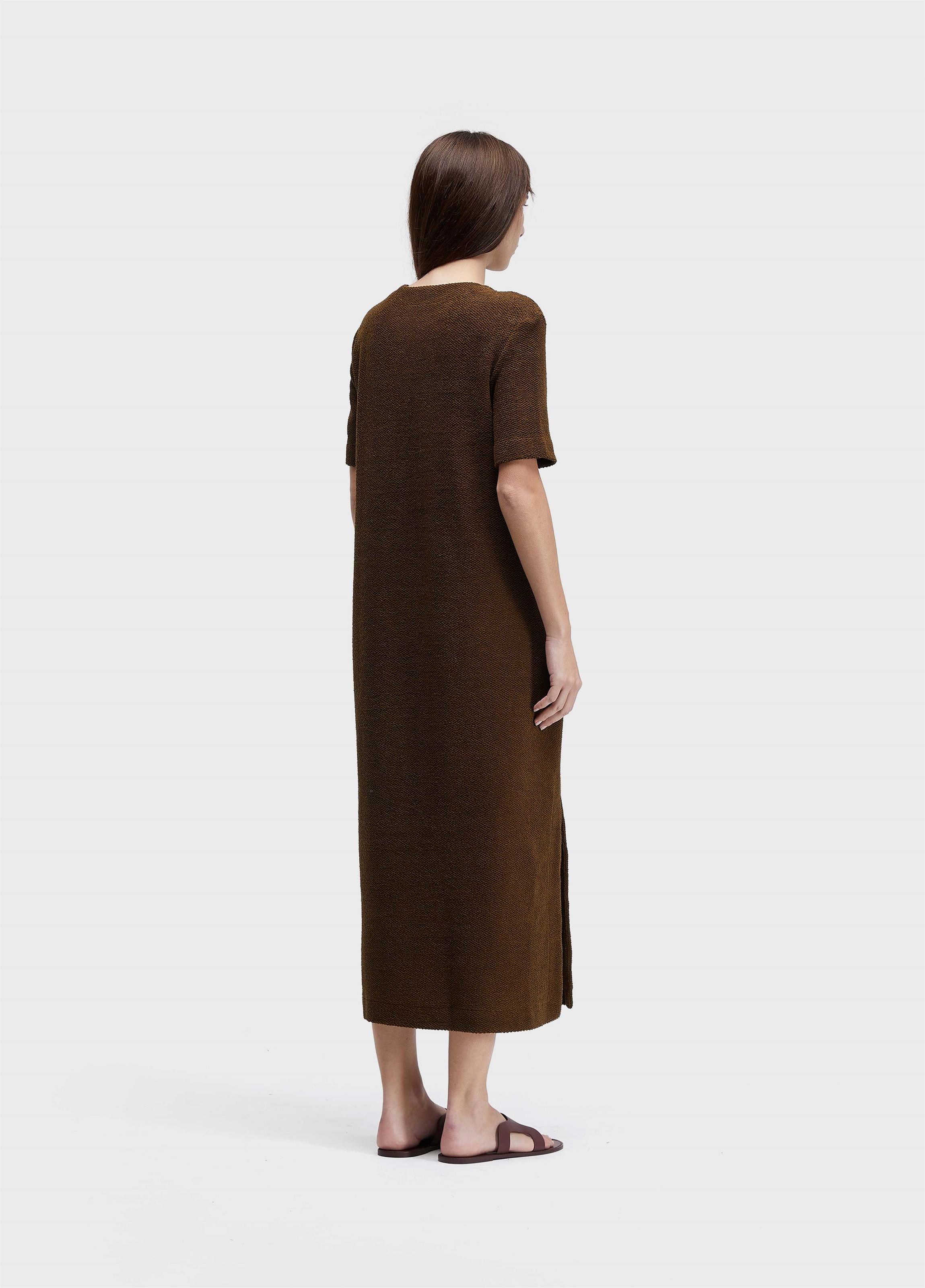 Vestido midi manga curta, com modelagem mais ajustada ao corpo. A peça possui gola levemente alta. Feito em moletom com fibras recicladas e amaciadas Bandeira RW - Recycle Fibres.