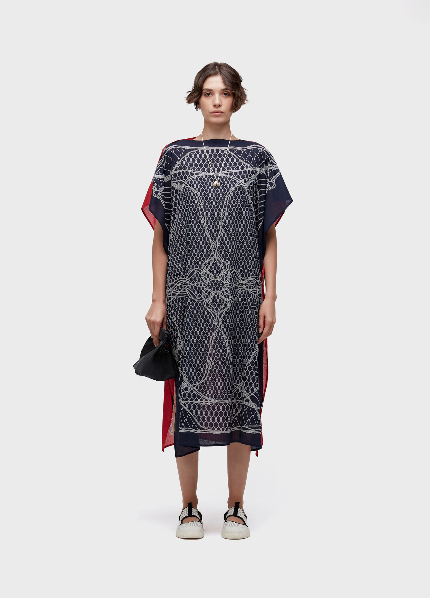Vestido com modelagem reta. A peça é toda aberta e possui fechamento com botão Osklen nas laterias e nos ombros. Feito em tecido 100% algodão, com estampa exclusiva Osklen, na versão Knot em vermelho e azul. Frente e costas possuem estampas/cores diferentes para uso dos dois lados. A peça pode ser totalmente aberta e usada como lenço.